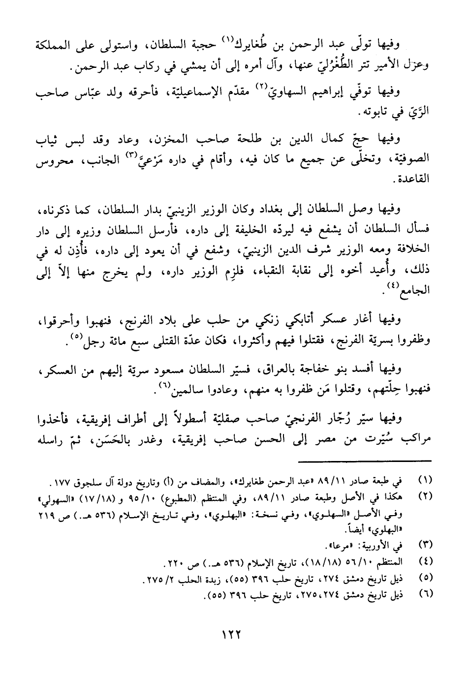 وَفِيهَا حَجَّ كَمَالُ الدَّيْنِ بْنُ طَلْحَةَ صَاحِبُ الْمَخْزَنِ، وَعَادَ وَقَدْ لَبِسَ ثِيَابَ الصُّوفِيَّةِ، وَتَخَلَّى عَنْ جَمِيعِ مَا كَانَ فِيهِ، وَأَقَامَ فِي دَارِهِ مَرْعِيَّ الْجَانِبِ مَحْرُوسَ الْقَاعِدَةِ.