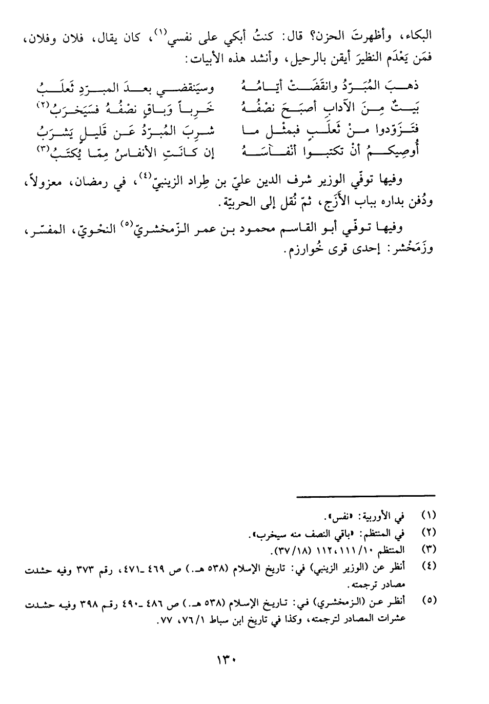 وَفِيهَا تُوُفِّيَ الْوَزِيرُ شَرَفُ الدِّينِ عَلِيُّ بْنُ طِرَادٍ الزَّيْنَبِيُّ، فِي رَمَضَانَ، مَعْزُولًا، وَدُفِنَ بِدَارِهِ بِبَابِ الْأَزَجِ، ثُمَّ نُقِلَ إِلَى الْحَرْبِيَّةِ.