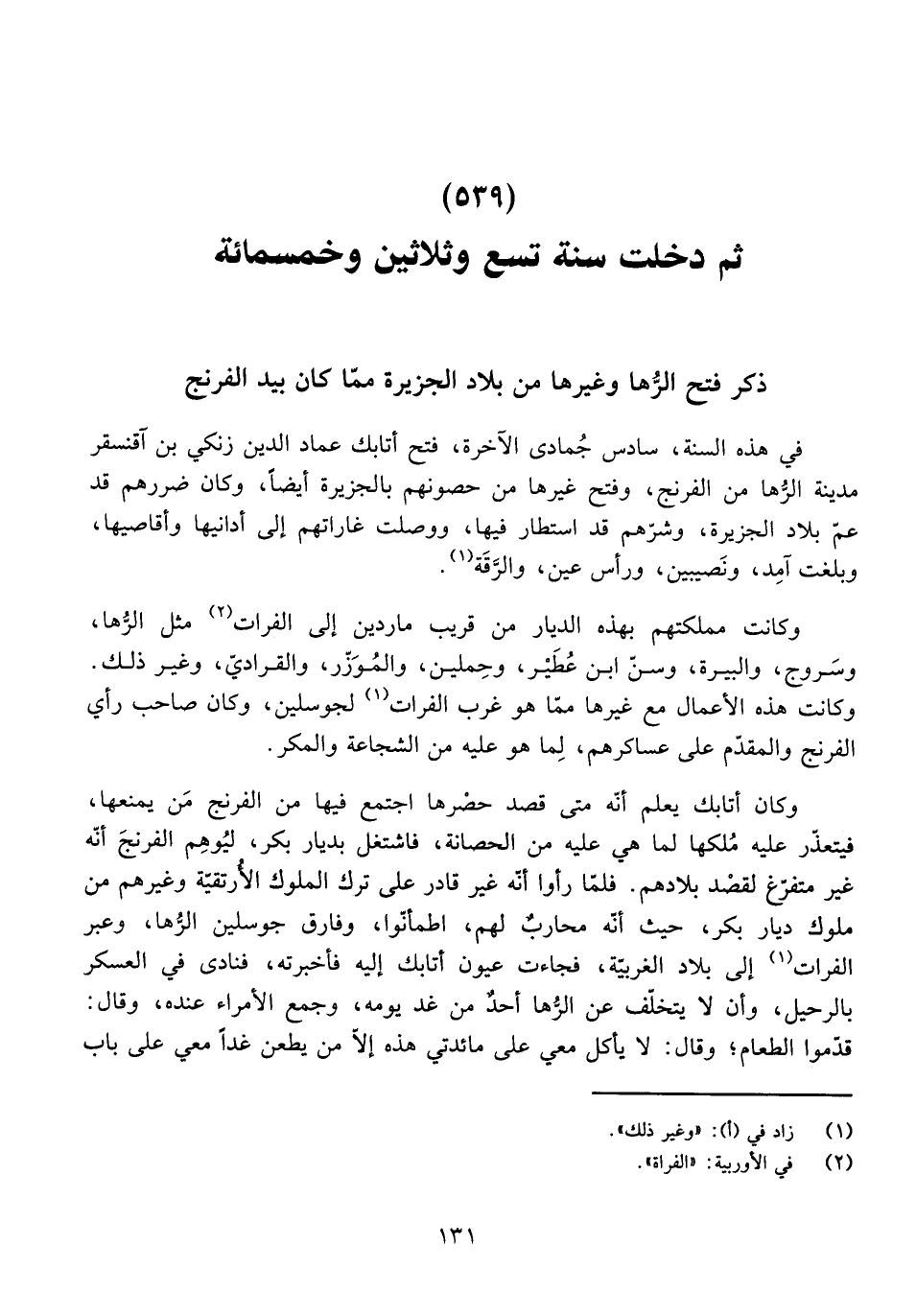 فِي هَذِهِ السَّنَةِ سَادِسَ جُمَادَى الْآخِرَةِ، فَتَحَ أَتَابَكُ عِمَادُ الدِّينِ زَنْكِي بْنُ آقْسُنْقُرْ مَدِينَةَ الرُّهَا مِنَ الْفِرِنْجِ، وَفَتَحَ غَيْرَهَا مِنْ حُصُونِهِمْ بِالْجَزِيرَةِ أَيْضًا، وَكَانَ ضَرَرُهُمْ قَدْ عَمَّ بِلَادَ الْجَزِيرَةِ، وَشَرُّهُمْ قَدِ اسْتَطَارَ فِيهَا، وَوَصَلَتْ غَارَاتُهُمْ إِلَى أَدَانِيهَا وَأَقَاصِيهَا، وَبَلَغَتْ آمِدَ، وَنَصِيبِينَ وَرَأْسَ عَيْنٍ، وَالرَّقَّةَ.