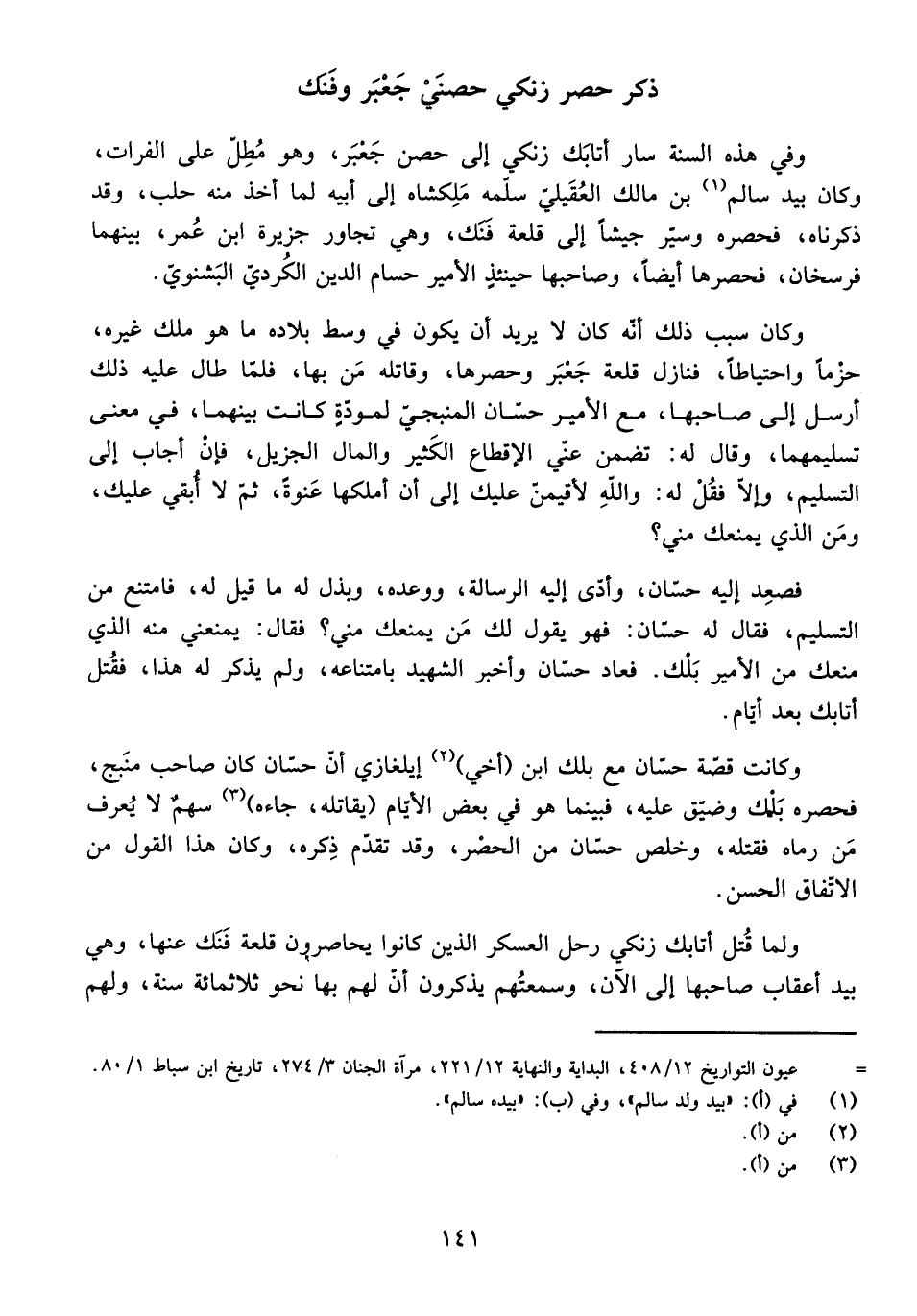 وَفِي هَذِهِ السَّنَةِ سَارَ أَتَابَكُ زَنْكِي إِلَى حِصْنِ جَعْبَرَ، وَهُوَ مُطِلٌّ عَلَى الْفُرَاتِ، وَكَانَ بِيَدِ سَالِمِ بْنِ مَالِكٍ الْعُقَيْلِيِّ سَلَّمَهُ السُّلْطَانُ مَلِكْشَاهْ إِلَى أَبِيهِ لَمَّا أَخَذَ مِنْهُ حَلَبَ، وَقَدْ ذَكَرْنَاهُ، فَحَصَرَهُ وَسَيَّرَ جَيْشًا إِلَى قَلْعَةِ فَنَكَ، وَهِيَ تُجَاوِرُ جَزِيرَةَ ابْنِ عُمَرَ، بَيْنَهُمَا فَرْسَخَانِ، فَحَصَرَهُمَا أَيْضًا، وَصَاحِبُهَا حِينَئِذٍ الْأَمِيرُ حُسَامُ الدَّيْنِ الْكُرْدِيُّ الْبَشْنَوِيُّ.