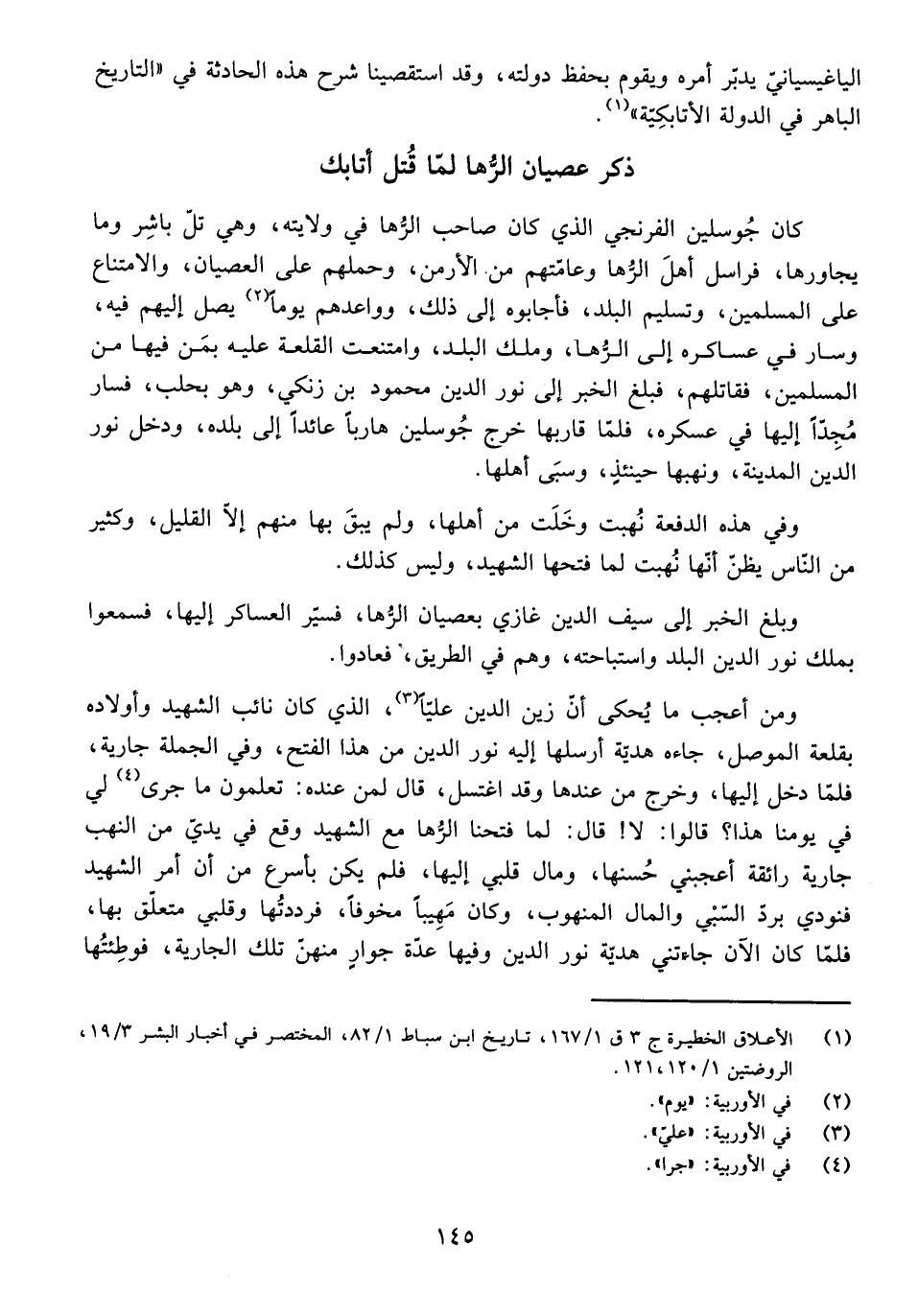 كَانَ جُوسْلِينُ الْفِرِنْجِيُّ الَّذِي كَانَ صَاحِبَ الرُّهَا فِي وِلَايَتِهِ، وَهِيَ تَلُّ بَاشِرَ وَمَا يُجَاوِرُهَا، فَرَاسَلَ أَهْلَ الرُّهَا، وَعَامَّتُهُمْ مِنَ الْأَرْمَنِ، وَحَمَلَهُمْ عَلَى الْعِصْيَانِ، وَالِامْتِنَاعِ عَلَى الْمُسْلِمِينَ، وَتَسْلِيمِ الْبَلَدِ، فَأَجَابُوهُ إِلَى ذَلِكَ، وَوَاعَدَهُمْ يَوْمًا يَصِلُ إِلَيْهِمْ فِيهِ، وَسَارَ فِي عَسَاكِرِهِ إِلَى الرُّهَا، وَمَلَكَ الْبَلَدَ، وَامْتَنَعَتِ الْقَلْعَةُ عَلَيْهِ بِمَنْ فِيهَا مِنَ الْمُسْلِمِينَ، فَقَاتَلَهُمْ، فَبَلَغَ الْخَبَرُ إِلَى نُورِ الدِّينِ مَحْمُودِ بْنِ زَنْكِي، وَهُوَ بِحَلَبَ، فَسَارَ مُجِدًّا إِلَيْهَا فِي عَسْكَرِهِ، فَلَمَّا قَارَبَهَا خَرَجَ جُوسْلِينُ هَارِبًا عَائِدًا إِلَى بَلَدِهِ، وَدَخَلَ نُورُ الدِّينِ الْمَدِينَةَ، وَنَهَبَهَا حِينَئِذٍ، وَسَبَى أَهْلَهَا.