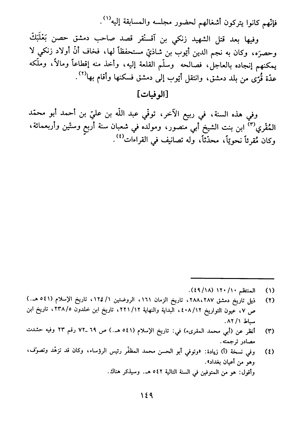 وَفِيهَا بَعْدَ قَتْلِ الشَّهِيدِ زَنْكِي بْنِ آقْسُنْقُرْ قَصَدَ صَاحِبُ دِمَشْقَ حِصْنَ بَعْلَبَكَّ وَحَصَرَهُ، وَكَانَ بِهِ نَجْمُ الدِّينِ أَيُّوبُ بْنُ شَاذِي مُسْتَحْفِظًا لَهَا، فَخَافَ أَنَّ أَوْلَادَ زَنْكِي لَا يُمْكِنُهُمْ إِنْجَادُهُ بِالْعَاجِلِ، فَصَالَحَهُ وَسَلَّمَ الْقَلْعَةَ إِلَيْهِ، وَأَخَذَ مِنْهُ إِقْطَاعًا وَمَالًا، وَمَلَّكَهُ عِدَّةَ قُرًى مِنْ بَلَدِ دِمَشْقَ، وَانْتَقَلَ أَيُّوبُ إِلَى دِمَشْقَ فَسَكَنَهَا وَأَقَامَ بِهَا.