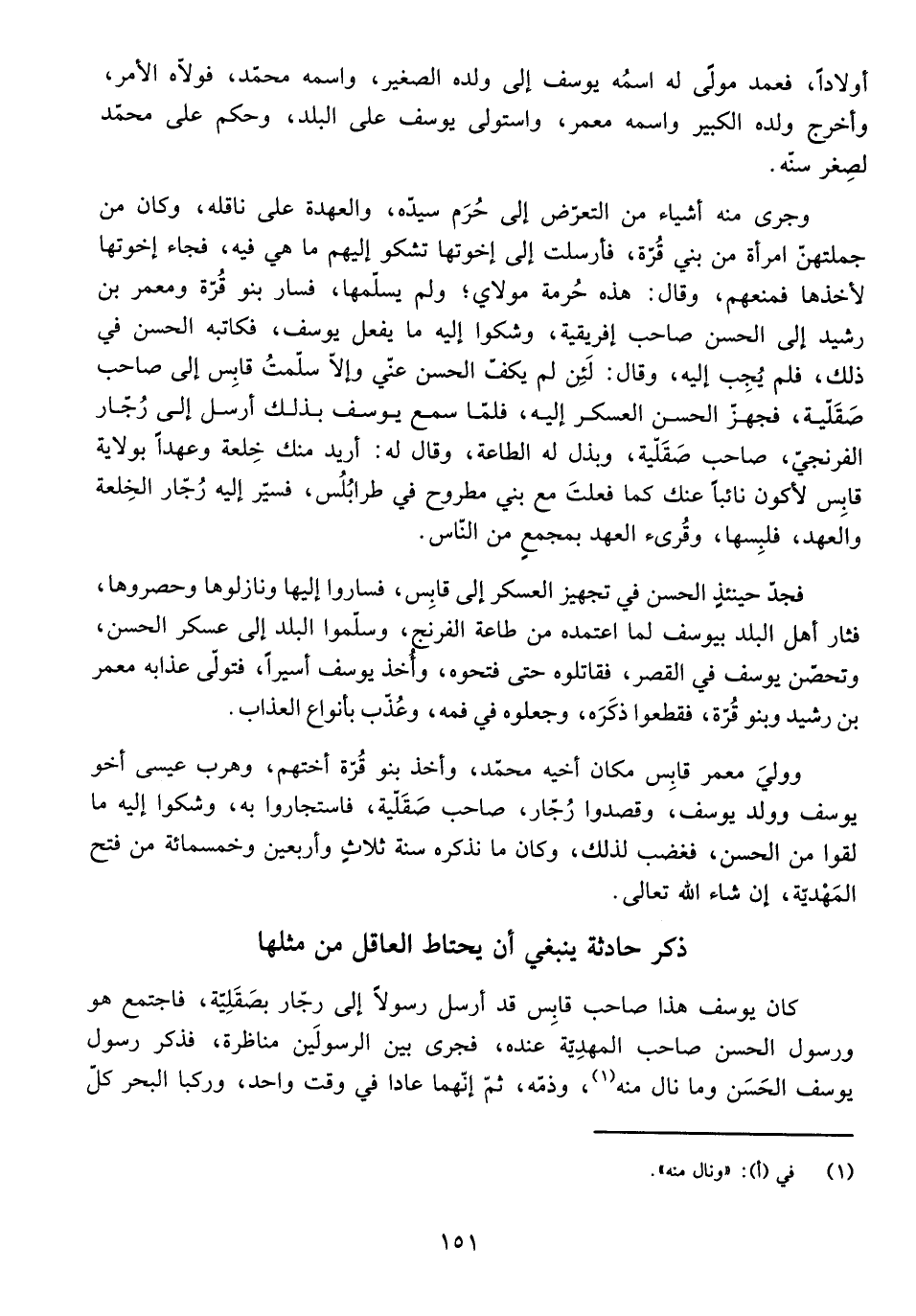 كَانَ يُوسُفُ هَذَا صَاحِبَ قَابِسَ قَدْ أَرْسَلَ رَسُولًا إِلَى رُجَّارَ بِصِقِلِّيَةَ، فَاجْتَمَعَ هُوَ وَرَسُولُ الْحَسَنِ صَاحِبِ الْمَهْدِيَّةِ عِنْدَهُ، فَجَرَى بَيْنَ الرَّسُولَيْنِ مُنَاظَرَةٌ، فَذَكَرَ رَسُولُ يُوسُفَ الْحَسَنَ وَمَا نَالَ مِنْهُ، وَذَمَّهُ، ثُمَّ إِنَّهُمَا عَادَا فِي وَقْتٍ وَاحِدٍ، وَرَكِبَا الْبَحْرَ كُلُّ