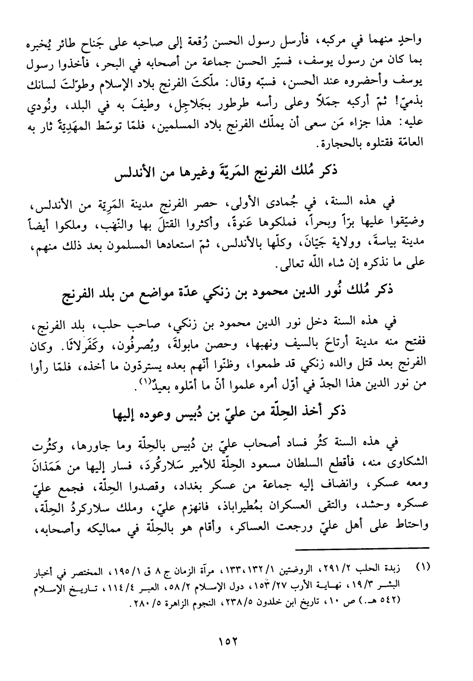 فِي هَذِهِ السَّنَةِ دَخَلَ نُورُ الدِّينِ مَحْمُودُ بْنُ زَنْكِي صَاحِبُ حَلَبَ بَلَدَ الْفِرِنْجِ، فَفَتَحَ مِنْهُ مَدِينَةَ أَرْتَاحَ بِالسَّيْفِ وَنَهَبَهَا، وَحِصْنَ مَابُولَةَ، وَبُصْرَفُونَ وَكَفَرْلَاثَا. وَكَانَ الْفِرِنْجُ بَعْدَ قَتْلِ وَالِدِهِ زَنْكِي قَدْ طَمِعُوا، وَظَنُّوا أَنَّهُمْ بَعْدَهُ يَسْتَرِدُّونَ مَا أَخَذَهُ، فَلَمَّا رَأَوْا مِنْ نُورِ الدِّينِ هَذَا الْجِدَّ فِي أَوَّلِ أَمْرِهِ عَلِمُوا أَنَّ مَا أَمَّلُوهُ بِعِيدٌ.