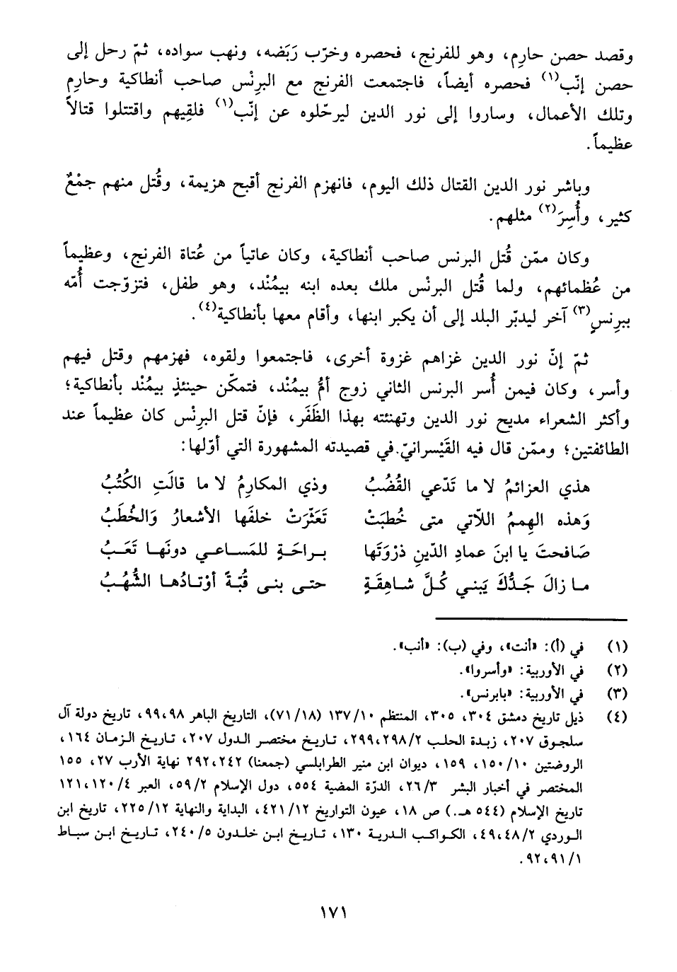 ثُمَّ إِنَّ نُورَ الدِّينِ غَزَاهُمْ غَزْوَةً أُخْرَى، فَاجْتَمَعُوا وَلَقُوهُ، فَهَزَمَهُمْ وَقَتَلَ فِيهِمْ وَأَسَرَ، وَكَانَ فِيمَنْ أُسِرَ الْبِرِنْسُ الثَّانِي زَوْجُ أُمِّ بِيمُنْدَ، فَتَمَكَّنَ حِينَئِذٍ بِيمُنْدُ بِأَنْطَاكِيَةَ ; وَأَكْثَرَ الشُّعَرَاءُ مَدِيحَ نُورِ الدِّينِ وَتَهْنِئَتَهُ بِهَذَا الظَّفَرِ، فَإِنَّ قَتْلَ الْبِرِنْسِ كَانَ عَظِيمًا عِنْدَ الطَّائِفَتَيْنِ، وَمِمَّنْ قَالَ فِيهِ الْقَيْسَرَانِيُّ فِي قَصِيدَتِهِ الْمَشْهُورَةِ الَّتِي أَوَّلُهَا: