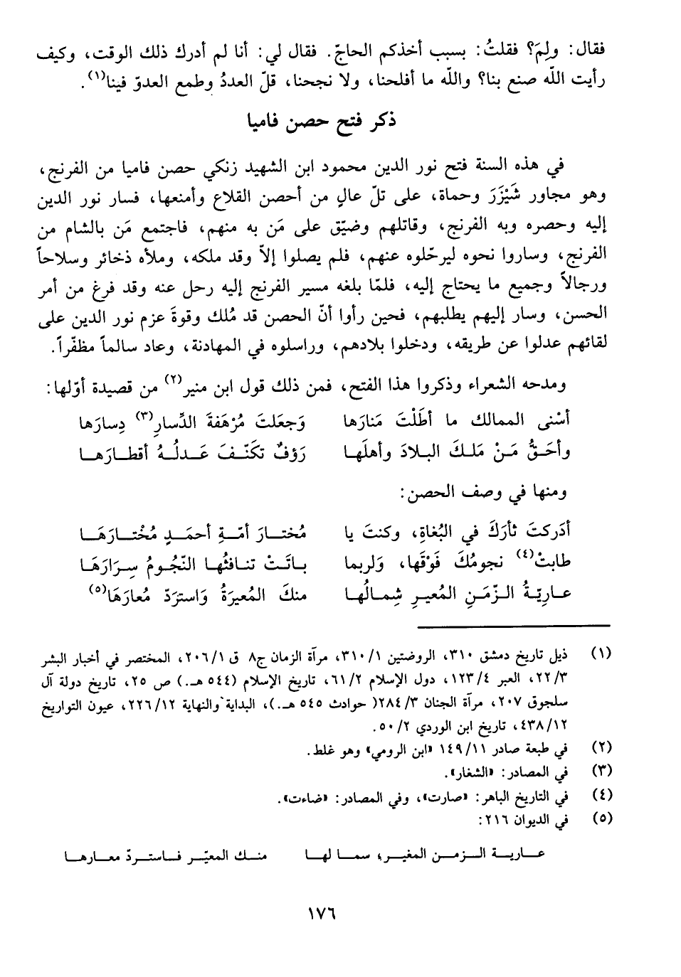 ذِكْرُ فَتْحِ حِصْنِ فَامِيَّا فِي هَذِهِ السَّنَةِ فَتَحَ نُورُ الدِّينِ مَحْمُودٌ ابْنُ الشَّهِيدِ زَنْكِي حِصْنَ فَامِيَّا مِنَ الْفِرِنْجِ، وَهُوَ مُجَاوِرُ شَيْزَرَ وَحَمَاةَ، عَلَى تَلٍّ عَالٍ مِنْ أَحْصَنِ الْقِلَاعِ وَأَمْنَعِهَا، فَسَارَ نُورُ الدِّينِ إِلَيْهِ وَحَصَرَهُ وَبِهِ الْفِرِنْجُ، وَقَاتَلَهُمْ وَضَيَّقَ عَلَى مَنْ بِهِ مِنْهُمْ، فَاجْتَمَعَ مَنْ بِالشَّامِ مِنَ الْفِرِنْجِ وَسَارُوا نَحْوَهُ لِيُرَحِّلُوهُ عَنْهُمْ، فَلَمْ يَصِلُوا إِلَّا وَقَدْ مَلَكَهُ، وَمَلَأَهُ ذَخَائِرَ وَسِلَاحًا وَرِجَالًا وَجَمِيعَ مَا يُحْتَاجُ إِلَيْهِ، فَلَمَّا بَلَغَهُ مَسِيرُ الْفِرِنْجِ إِلَيْهِ رَحَلَ عَنْهُ وَقَدْ فَرَغَ مِنْ أَمْرِ الْحِصْنِ وَسَارَ إِلَيْهِمْ يَطْلُبُهُمْ، فَحِينَ رَأَوْا أَنَّ الْحِصْنَ قَدْ مُلِكَ وَقُوَّةَ عَزْمِ نُورِ الدِّينِ عَلَى لِقَائِهِمْ عَدَلُوا عَنْ طَرِيقِهِ، وَدَخَلُوا بِلَادَهُمْ وَرَاسَلُوهُ فِي الْمُهَادَنَةِ، وَعَادَ سَالِمًا مُظَفَّرًا.