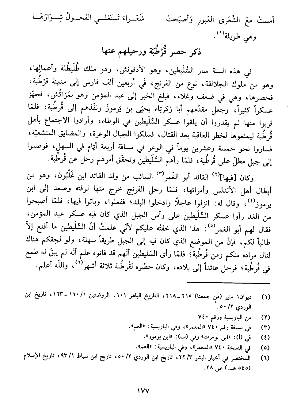 فِي هَذِهِ السَّنَةِ سَارَ السُّلَيْطِينُ، وَهُوَ الْأَذْفُونْشُ، وَهُوَ مَلِكُ طُلَيْطِلَةَ وَأَعْمَالِهَا، وَهُوَ مِنْ مُلُوكِ الْجَلَالِقَةِ نَوْعٍ مِنَ الْفِرِنْجِ، فِي أَرْبَعِينَ أَلْفَ فَارِسٍ إِلَى مَدِينَةِ قُرْطُبَةَ، فَحَصَرَهَا، وَهِيَ فِي ضَعْفٍ وَغَلَاءٍ، فَبَلَغَ الْخَبَرُ إِلَى عَبْدِ الْمُؤْمِنِ وَهُوَ بِمَرَّاكُشَ، فَجَهَّزَ عَسْكَرًا كَثِيرًا، وَجَعَلَ مُقَدَّمَهُمْ أَبَا زَكَرِيَّاءَ يَحْيَى بْنَ يَرْمُوزَ وَنَفَّذَهُمْ إِلَى قُرْطُبَةَ، فَلَمَّا قَرُبُوا مِنْهَا لَمْ يَقْدِرُوا أَنْ يَلْقَوْا عَسْكَرَ السُّلَيْطِيِنِ فِي الْوِطَاءِ، وَأَرَادُوا الِاجْتِمَاعَ بِأَهْلِ قُرْطُبَةَ لِيَمْنَعُوهَا لِخَطَرِ الْعَاقِبَةِ بَعْدَ الْقِتَالِ، فَسَلَكُوا الْجِبَالَ الْوَعِرَةَ، وَالْمَضَايِقَ الْمُتَشَعِّبَةَ، فَسَارُوا نَحْوَ خَمْسَةٍ وَعِشْرِينَ يَوْمًا فِي الْوَعْرِ فِي مَسَافَةِ أَرْبَعَةِ أَيَّامٍ فِي السَّهْلِ، فَوَصَلُوا إِلَى جَبَلٍ مُطِلٍّ عَلَى قُرْطُبَةَ، فَلَمَّا رَآهُمُ السُّلَيْطِيِنُ وَتَحَقَّقَ أَمْرَهُمْ رَحَلَ عَنْ قُرْطُبَةَ.
