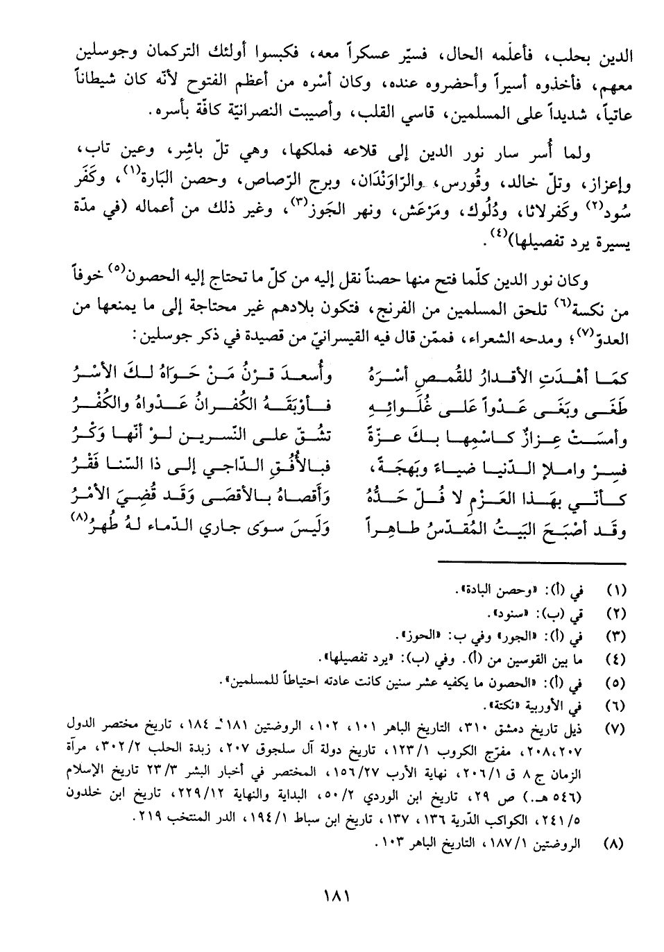 الدِّينِ بِحَلَبَ، فَأَعْلَمَهُ الْحَالَ، فَسَيَّرَ عَسْكَرًا مَعَهُ، فَكَبَسُوا أُولَئِكَ التُّرْكُمَانَ وَجُوسْلِينُ مَعَهُمْ، فَأَخَذُوهُ أَسِيرًا وَأَحْضَرُوهُ عِنْدَهُ، وَكَانَ أَسْرُهُ مِنْ أَعْظَمِ الْفُتُوحِ ; لِأَنَّهُ كَانَ شَيْطَانًا عَاتِيًا، شَدِيدًا عَلَى الْمُسْلِمِينَ، قَاسِيَ الْقَلْبِ، وَأُصِيبَتِ النَّصْرَانِيَّةُ كَافَّةً بِأَسْرِهِ.