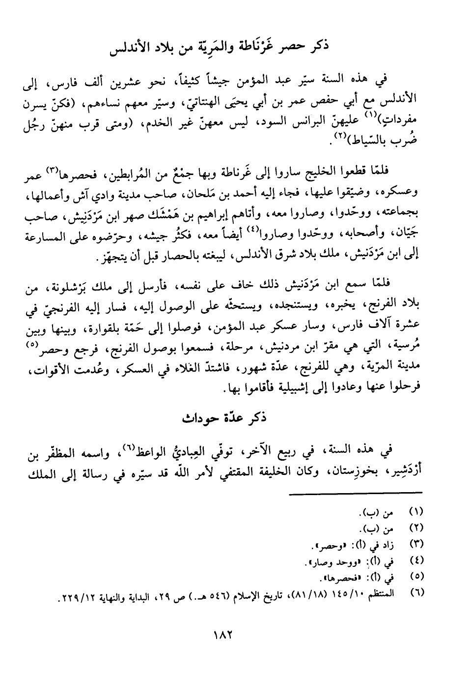 فِي هَذِهِ السَّنَةِ سَيَّرَ عَبْدُ الْمُؤْمِنِ جَيْشًا كَثِيفًا، نَحْوَ عِشْرِينَ أَلْفَ فَارِسٍ، إِلَى الْأَنْدَلُسِ مَعَ أَبِي حَفْصٍ عُمَرَ بْنِ أَبِي يَحْيَى الْهِنْتَاتِيِّ، وَسَيَّرَ مَعَهُمْ نِسَاءَهُمْ، (فَكُنَّ يَسِرْنَ مُفْرَدَاتٍ) عَلَيْهِنَّ الْبَرَانِسُ السُّودُ، لَيْسَ مَعَهُنَّ غَيْرُ الْخَدَمِ، (وَمَتَى قُرُبَ مِنْهُنَّ رَجُلٌ ضُرِبَ بِالسِّيَاطِ) .