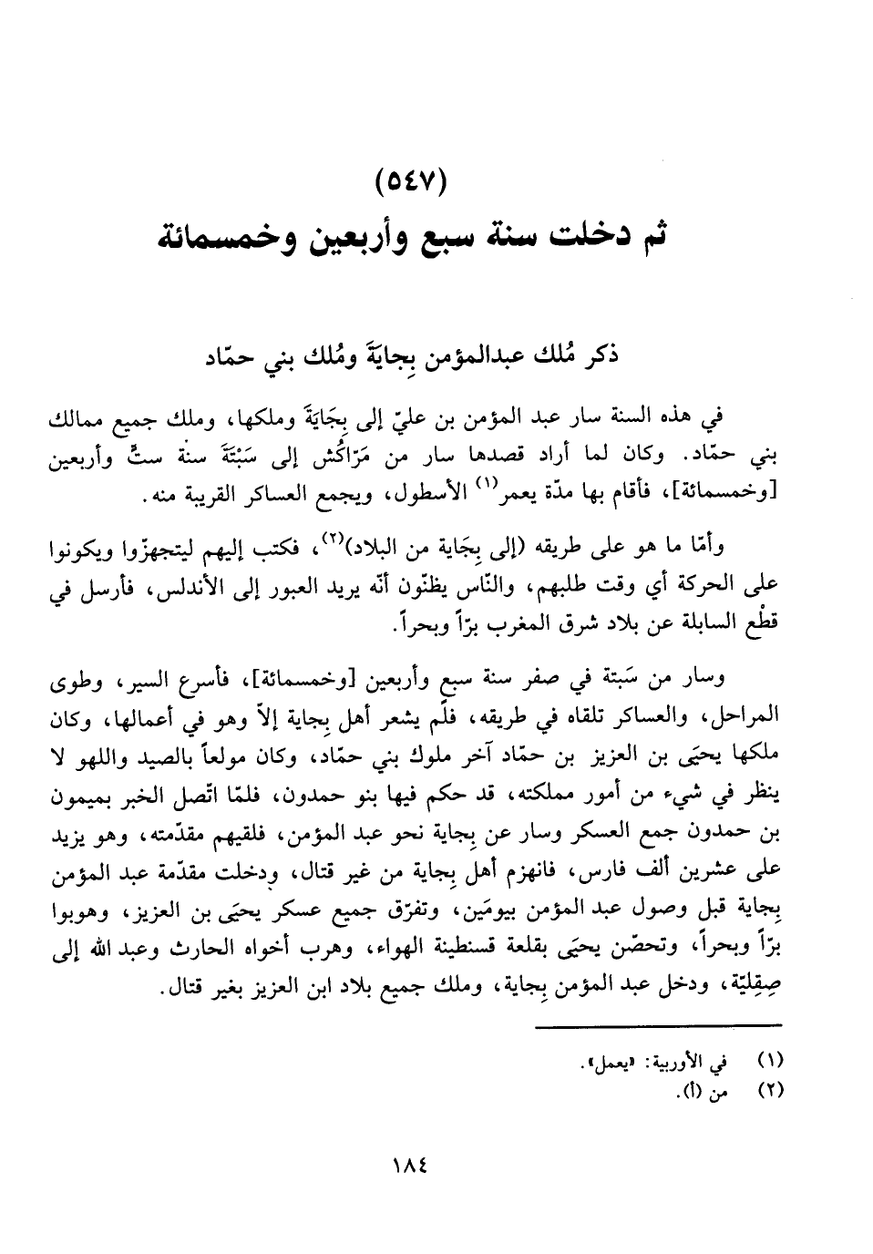 فِي هَذِهِ السَّنَةِ سَارَ عَبْدُ الْمُؤْمِنِ بْنُ عَلِيٍّ إِلَى بِجَايَةَ وَمَلَكَهَا، وَمَلَكَ جَمِيعَ مَمَالِكِ بَنِي حَمَّادٍ. وَكَانَ لَمَّا أَرَادَ قَصْدَهَا سَارَ مِنْ مَرَّاكُشَ إِلَى سَبْتَةَ سَنَةَ سِتٍّ وَأَرْبَعِينَ [وَخَمْسِمِائَةٍ] ، فَأَقَامَ بِهَا مُدَّةً يُعَمِّرُ الْأُسْطُولَ، وَيَجْمَعُ الْعَسَاكِرَ الْقَرِيبَةَ مِنْهُ.