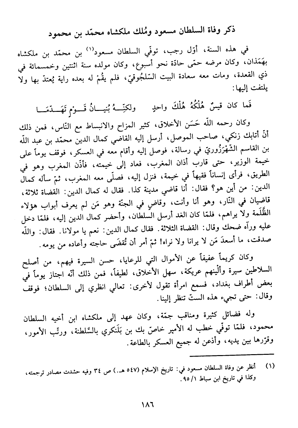 وَلَهُ فَضَائِلُ كَثِيرَةٌ وَمَنَاقِبُ جَمَّةٌ، وَكَانَ عَهِدَ إِلَى مَلِكْشَاهِ ابْنِ أَخِيهِ السُّلْطَانِ مَحْمُودٍ، فَلَمَّا تُوُفِّيَ خَطَبَ لَهُ الْأَمِيرُ خَاصُّ بِكْ بْنُ بَلَنْكَرِي بِالسَّلْطَنَةِ، وَرَتَّبَ الْأُمُورَ، وَقَرَّرَهَا بَيْنَ يَدَيْهِ، وَأَذْعَنَ لَهُ جَمِيعُ الْعَسْكَرِ بِالطَّاعَةِ.