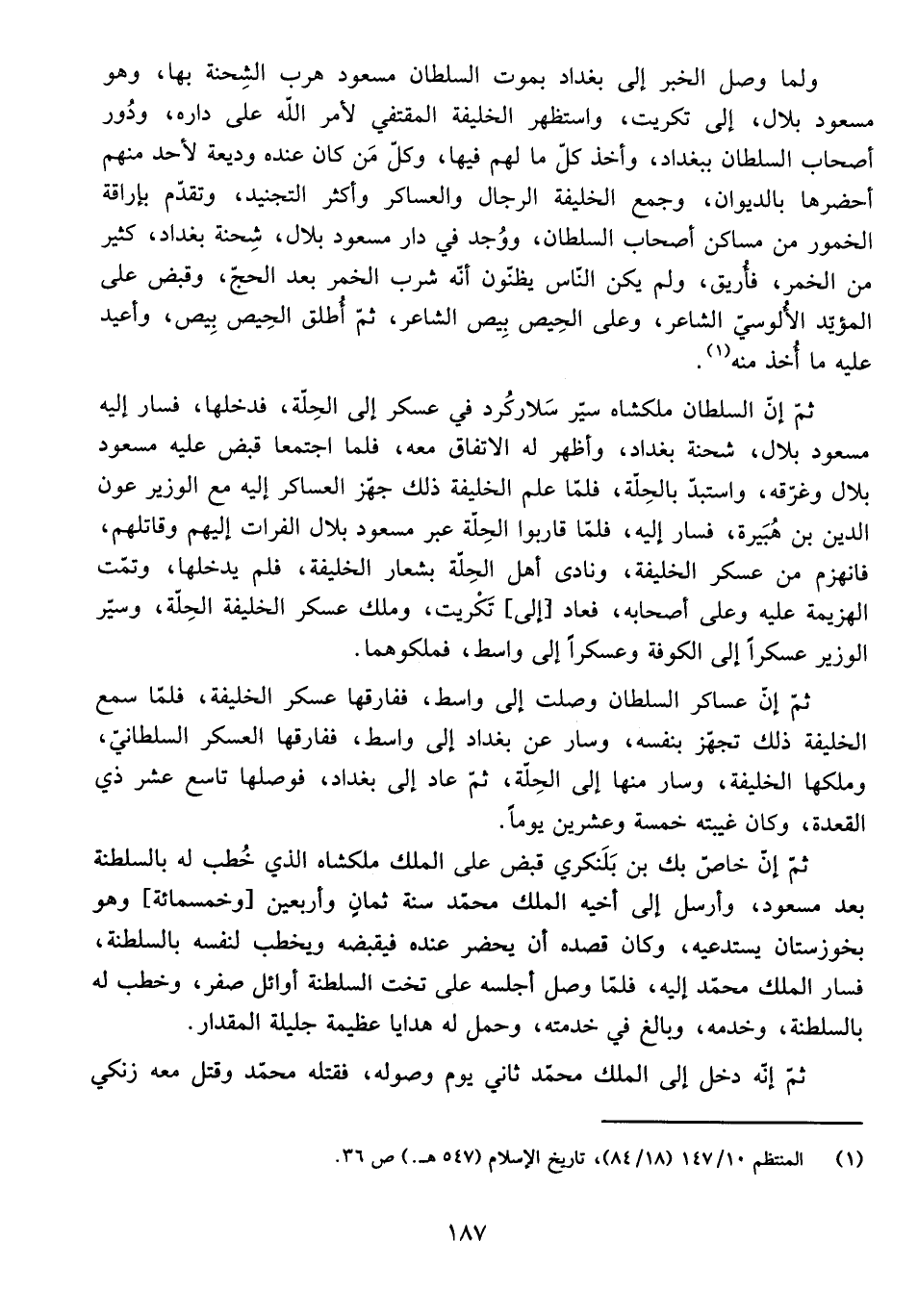 ثُمَّ إِنَّ السُّلْطَانَ مَلِكْشَاهْ سَيَّرَ سَلَارْكُرْدَ فِي عَسْكَرٍ إِلَى الْحِلَّةِ، فَدَخَلَهَا، فَسَارَ إِلَيْهِ مَسْعُودُ بِلَالٍ، شِحْنَةُ بَغْدَادَ، وَأَظْهَرَ لَهُ الِاتِّفَاقَ مَعَهُ، فَلَمَّا اجْتَمَعَا قَبْضَ عَلَيْهِ مَسْعُودُ بِلَالٍ وَغَرَّقَهُ، وَاسْتَبَدَّ بِالْحِلَّةِ، فَلَمَّا عَلِمَ الْخَلِيفَةُ ذَلِكَ جَهَّزَ الْعَسَاكِرَ إِلَيْهِ مَعَ الْوَزِيرِ عَوْنِ الدِّينِ بْنِ هُبَيْرَةَ، فَسَارَ إِلَيْهِ، فَلَمَّا قَارَبُوا الْحِلَّةَ عَبَرَ مَسْعُودُ بِلَالٍ الْفُرَاتَ إِلَيْهِمْ وَقَاتَلَهُمْ، فَانْهَزَمَ مِنْ عَسْكَرِ الْخَلِيفَةِ، وَنَادَى أَهْلُ الْحِلَّةِ بِشِعَارِ الْخَلِيفَةِ، فَلَمْ يَدْخُلْهَا، وَتَمَّتِ الْهَزِيمَةُ عَلَيْهِ وَعَلَى أَصْحَابِهِ، فَعَادَ [إِلَى] تَكْرِيتَ، وَمَلَكَ عَسْكَرُ الْخَلِيفَةِ الْحِلَّةِ، وَسَيَّرَ الْوَزِيرُ عَسْكَرًا إِلَى وَاسِطَ، فَمَلَكُوهُمَا.