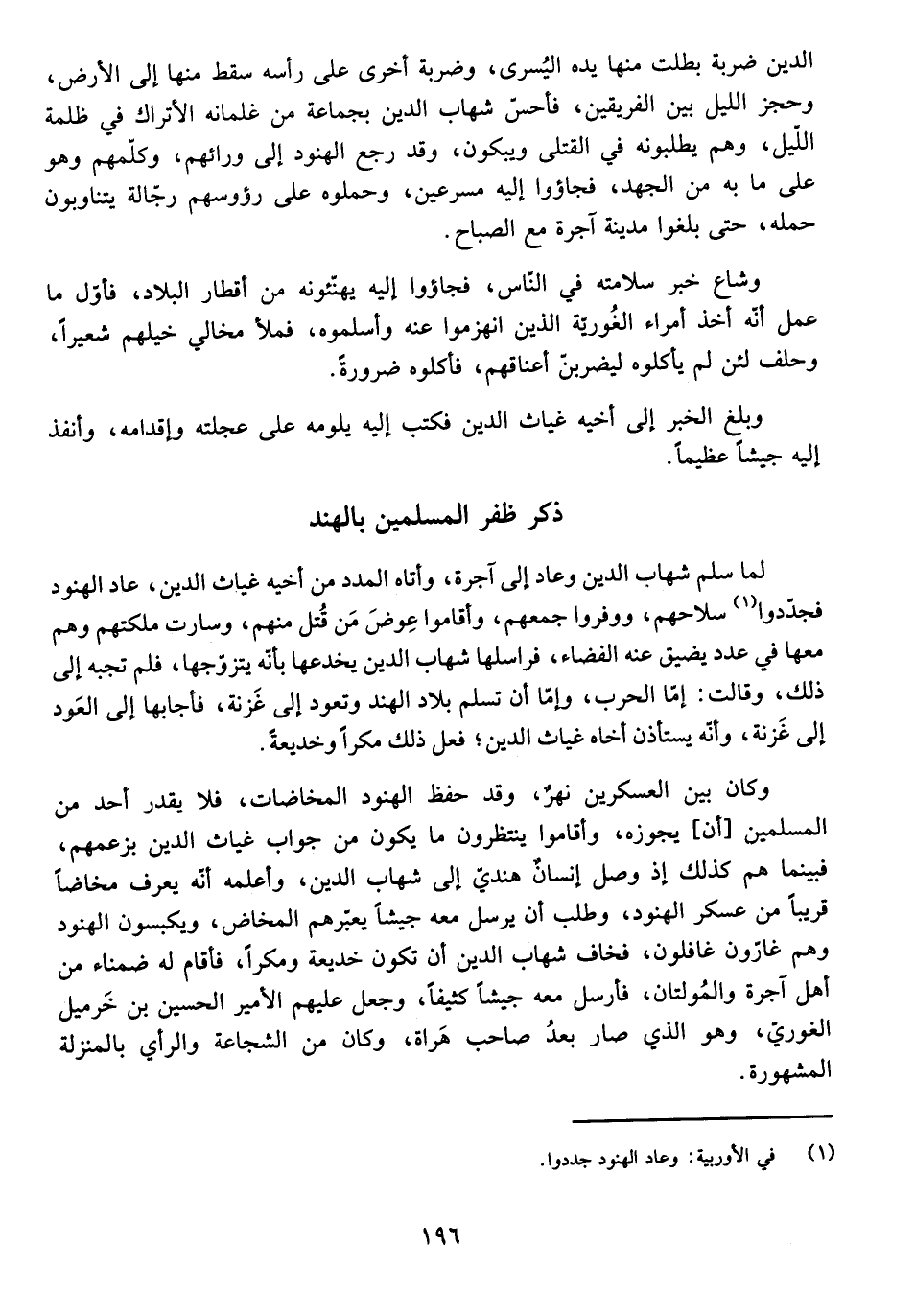 الدِّينِ ضَرْبَةٌ بَطَلَتْ مِنْهَا يَدُهُ الْيُسْرَى، وَضَرْبَةٌ أُخْرَى عَلَى رَأْسِهِ سَقَطَ مِنْهَا إِلَى الْأَرْضِ، وَحَجَزَ اللَّيْلُ بَيْنَ الْفَرِيقَيْنِ، فَأَحَسَّ شِهَابُ الدِّينِ بِجَمَاعَةٍ مِنْ غِلْمَانِهِ الْأَتْرَاكِ فِي ظُلْمَةِ اللَّيْلِ وَهُمْ يَطْلُبُونَهُ فِي الْقَتْلَى وَيَبْكُونَ، وَقَدْ رَجَعَ الْهُنُودُ إِلَى وَرَائِهِمْ، وَكَلَّمَهُمْ وَهُوَ عَلَى مَا بِهِ مِنَ الْجَهْدِ، فَجَاءُوا إِلَيْهِ مُسْرِعِينَ، وَحَمَلُوهُ عَلَى رُءُوسِهِمْ رَجَّالَةً يَتَنَاوَبُونَ حَمْلَهُ، حَتَّى بَلَغُوا مَدِينَةَ آجُرَةَ مَعَ الصَّبَاحِ.