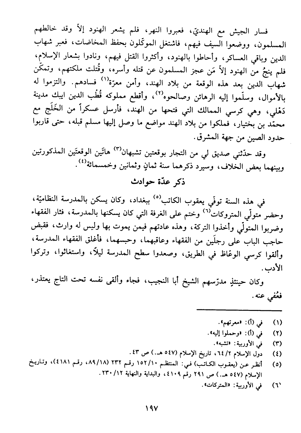 فِي هَذِهِ السَّنَةِ تُوُفِّيَ يَعْقُوبُ الْكَاتِبُ بِبَغْدَادَ، وَكَانَ يَسْكُنُ بِالْمَدْرَسَةِ النِّظَامِيَّةِ، وَحَضَرَ مُتَوَلِّي الْمَتْرُوكَاتِ وَخَتَمَ عَلَى الْغُرْفَةِ الَّتِي كَانَ يَسْكُنُهَا بِالْمَدْرَسَةِ، فَثَارَ الْفُقَهَاءُ وَضَرَبُوا الْمُتَوَلِّيَ وَأَخَذُوا التَّرِكَةَ، وَهَذِهِ عَادَتُهُمْ فِيمَنْ يَمُوتُ بِهَا وَلَيْسَ لَهُ وَارِثٌ، فَقَبَضَ حَاجِبُ الْبَابِ عَلَى رَجُلَيْنِ مِنَ الْفُقَهَاءِ وَعَاقَبَهُمَا، وَحَبَسَهُمَا، فَأَغْلَقَ الْفُقَهَاءُ الْمَدْرَسَةَ، وَأَلْقَوْا كُرْسِيَّ الْوُعَّاظِ فِي الطَّرِيقِ، وَصَعِدُوا سَطْحَ الْمَدْرَسَةِ لَيْلًا، وَاسْتَغَاثُوا، وَتَرَكُوا الْأَدَبَ.