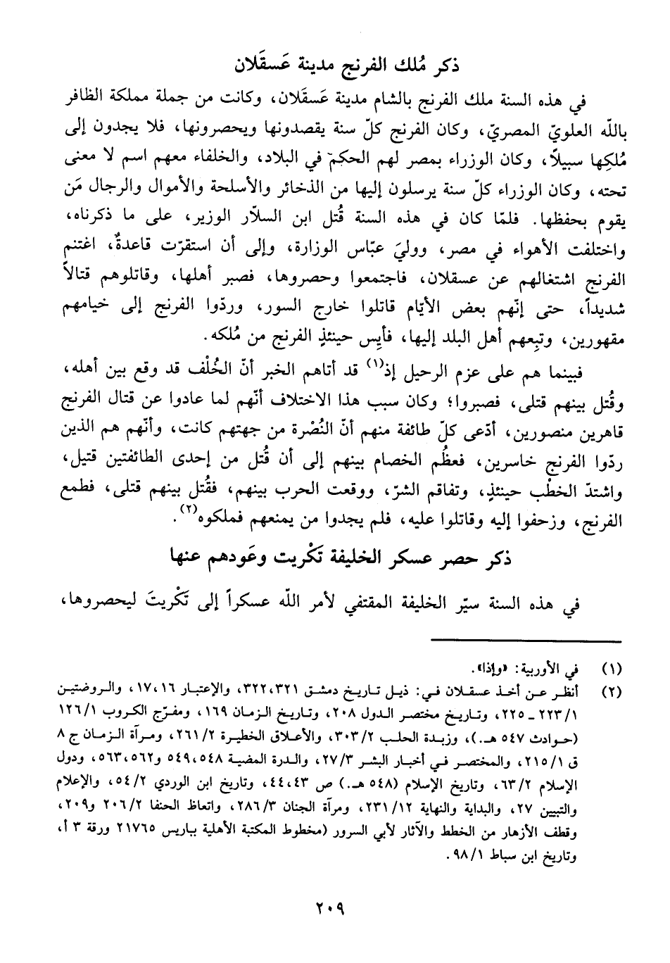 فِي هَذِهِ السَّنَةِ مَلَكَ الْفِرِنْجُ بِالشَّامِ مَدِينَةَ عَسْقَلَانَ، وَكَانَتْ مِنْ جُمْلَةِ مَمْلَكَةِ الظَّافِرِ بِاللَّهِ الْعَلَوِيِّ الْمِصْرِيِّ، وَكَانَ الْفِرِنْجُ كُلَّ سَنَةٍ يَقْصِدُونَهَا وَيَحْصُرُونَهَا، فَلَا يَجِدُونَ إِلَى مُلْكِهَا سَبِيلًا، وَكَانَ الْوُزَرَاءُ بِمِصْرَ لَهُمُ الْحُكْمُ فِي الْبِلَادِ، وَالْخُلَفَاءُ مَعَهُمُ اسْمٌ لَا مَعْنَى تَحْتَهُ، وَكَانَ الْوُزَرَاءُ كُلَّ سَنَةٍ يُرْسِلُونَ إِلَيْهَا مِنَ الذَّخَائِرِ وَالْأَسْلِحَةِ وَالْأَمْوَالِ وَالرِّجَالِ مَنْ يَقُومُ بِحِفْظِهَا. فَلَمَّا كَانَ فِي هَذِهِ السَّنَةِ قُتِلَ ابْنُ السَّلَارِ الْوَزِيرُ، عَلَى مَا ذَكَرْنَاهُ، وَاخْتَلَفَتِ الْأَهْوَاءُ فِي مِصْرَ، وَوَلِيَ عَبَّاسٌ الْوِزَارَةَ، وَإِلَى أَنِ اسْتَقَرَّتْ قَاعِدَةٌ، اغْتَنَمَ الْفِرِنْجُ اشْتِغَالَهُمْ عَنْ عَسْقَلَانَ، فَاجْتَمَعُوا وَحَصَرُوهَا، فَصَبَرَ أَهْلُهَا، وَقَاتَلُوهُمْ قِتَالًا شَدِيدًا، حَتَّى إِنَّهُمْ بَعْضَ الْأَيَّامِ قَاتَلُوا خَارِجَ السُّورِ، وَرَدُّوا الْفِرِنْجَ إِلَى خِيَامِهِمْ مَقْهُورِينَ، وَتَبِعَهُمْ أَهْلُ الْبَلَدِ إِلَيْهَا فَأَيِسَ حِينَئِذٍ الْفِرِنْجُ مِنْ مُلْكِهِ.
