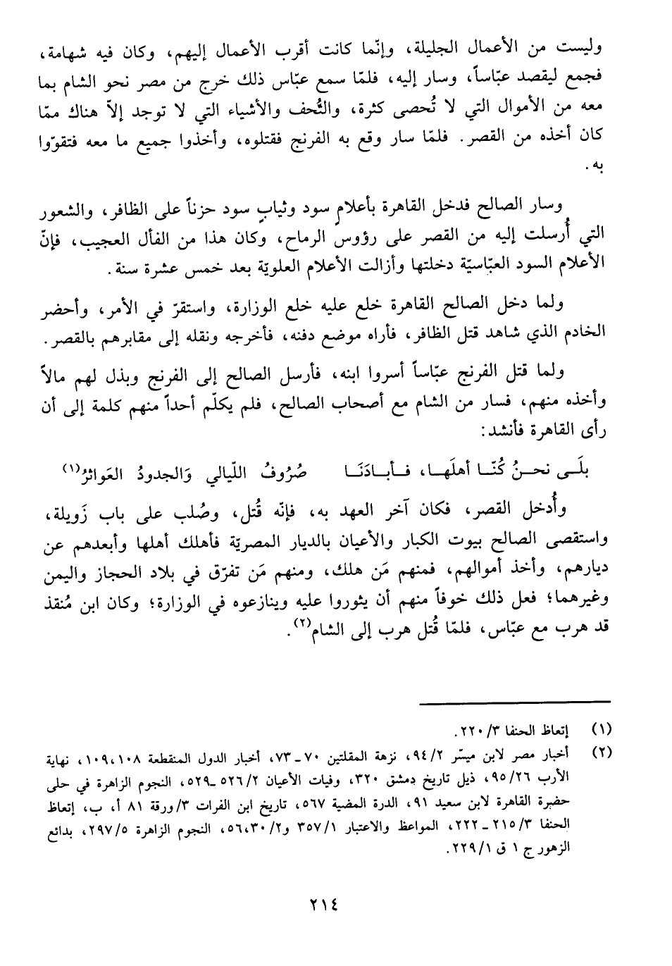 وَأُدْخِلَ الْقَصْرَ، فَكَانَ آخِرَ الْعَهْدِ بِهِ، فَإِنَّهُ قُتِلَ، وَصُلِبَ عَلَى بَابِ زُوَيْلَةَ، وَاسْتَقْصَى الصَّالِحُ بُيُوتَ الْكِبَارِ وَالْأَعْيَانِ بِالدِّيَارِ الْمِصْرِيَّةِ فَأَهْلَكَ أَهْلَهَا وَأَبْعَدَهُمْ عَنْ دِيَارِهِمْ، وَأَخَذَ أَمْوَالَهُمْ، فَمِنْهُمْ مَنْ هَلَكَ، وَمِنْهُمْ مَنْ تَفَرَّقَ فِي بِلَادِ الْحِجَازِ وَالْيَمَنِ وَغَيْرِهِمَا ; فَعَلَ ذَلِكَ خَوْفًا مِنْهُمْ أَنْ يَثُورُوا عَلَيْهِ وَيُنَازِعُوهُ فِي الْوِزَارَةِ ; وَكَانَ ابْنُ مُنْقِذٍ قَدْ هَرَبَ مَعَ عَبَّاسٍ، فَلَمَّا قُتِلَ هَرَبَ إِلَى الشَّامِ.