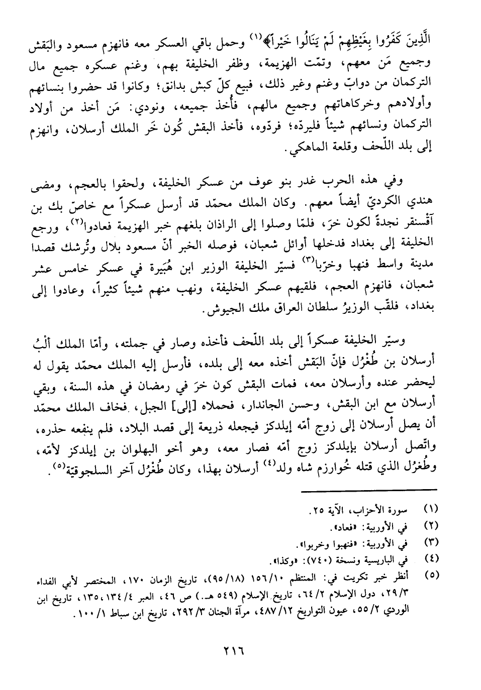 وَحَمَلَ بَاقِي الْعَسْكَرِ مَعَهُ فَانْهَزَمَ مَسْعُودٌ وَالْبَقْشُ وَجَمِيعُ مَنْ مَعَهُمْ، وَتَمَّتِ الْهَزِيمَةُ، وَظَفَرَ الْخَلِيفَةُ بِهِمْ، وَغَنَمَ عَسْكَرُهُ جَمِيعَ مَالِ التُّرْكُمَانِ مِنْ دَوَابَّ وَغَنَمٍ وَغَيْرِ ذَلِكَ، فَبِيعَ كُلُّ كَبْشٍ بِدَانَقٍ ; وَكَانُوا قَدْ حَضَرُوا بِنِسَائِهِمْ وَأَوْلَادِهِمْ وَخَرَكَاهَاتِهِمْ وَجَمِيعِ مَالِهِمْ، فَأُخِذَ جَمِيعُهُ، وَنُودِيَ: مَنْ أَخَذَ مِنْ أَوْلَادِ التُّرْكُمَانِ وَنِسَائِهِمْ شَيْئًا فَلْيَرُدَّهُ ; فَرَدُّوهُ، فَأَخَذَ الْبَقْشُ كُونْ خَرْ الْمَلِكَ أَرْسَلَانَ، وَانْهَزَمَ إِلَى بَلَدِ اللِّحْفِ وَقَلْعَةِ الْمَاهِكِي.