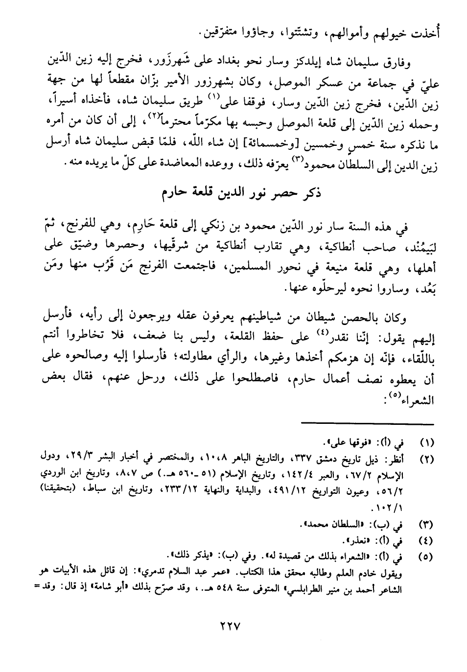 وَكَانَ بِالْحِصْنِ شَيْطَانٌ مِنْ شَيَاطِينِهِمْ يَعْرِفُونَ عَقْلَهُ وَيَرْجِعُونَ إِلَى رَأْيِهِ، فَأَرْسَلَ إِلَيْهِمْ يَقُولُ: إِنَّنَا نَقْدِرُ عَلَى حِفْظِ الْقَلْعَةِ، وَلَيْسَ بِنَا ضَعْفٌ، فَلَا تُخَاطِرُوا أَنْتُمْ بِاللِّقَاءِ، فَإِنَّهُ إِنْ هَزَمَكُمْ أَخَذَهَا وَغَيْرَهَا، وَالرَّأْيُ مُطَاوَلَتُهُ ; فَأَرْسَلُوا إِلَيْهِ وَصَالَحُوهُ عَلَى أَنْ يُعْطُوهُ نِصْفَ أَعْمَالِ حَارِمَ، فَاصْطَلَحُوا عَلَى ذَلِكَ، وَرَحَلَ عَنْهُمْ، فَقَالَ بَعْضُ الشُّعَرَاءِ: