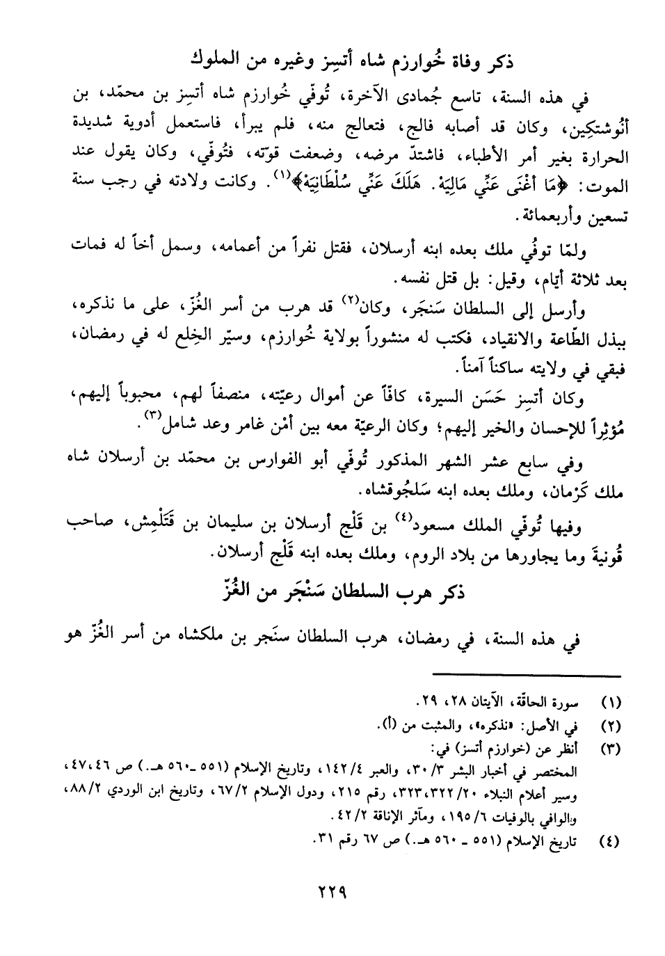 فِي هَذِهِ السَّنَةِ تَاسِعَ جُمَادَى الْآخِرَةِ تُوُفِّيَ خَوَارَزْمُ شَاهْ أَتْسِزُ بْنُ مُحَمَّدِ بْنِ أَنُوشِتِكِينَ، وَكَانَ قَدْ أَصَابَهُ فَالِجٌ، فَتَعَالَجَ مِنْهُ فَلَمْ يَبْرَأْ، فَاسْتَعْمَلَ أَدْوِيَةً شَدِيدَةَ الْحَرَارَةِ بِغَيْرِ أَمْرِ الْأَطِبَّاءِ، فَاشْتَدَّ مَرَضُهُ، وَضَعُفَتْ قُوَّتُهُ، فَتُوُفِّيَ. وَكَانَ يَقُولُ عِنْدَ الْمَوْتِ: {مَا أَغْنَى عَنِّي مَالِيَهْ - هَلَكَ عَنِّي سُلْطَانِيَهْ} [الحاقة: 28 - 29] ، وَكَانَتْ وِلَادَتُهُ فِي رَجَبٍ سَنَةَ تِسْعِينَ وَأَرْبَعِمِائَةٍ.