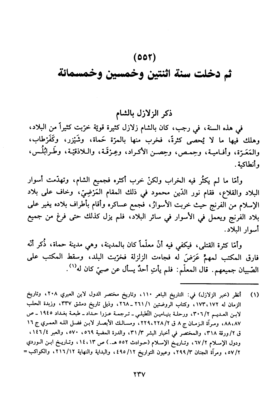 فِي هَذِهِ السَّنَةِ فِي رَجَبٍ، كَانَ بِالشَّامِ زَلَازِلُ كَثِيرَةٌ قَوِيَّةٌ خَرَّبَتْ كَثِيرًا مِنَ الْبِلَادِ، وَهَلَكَ فِيهَا مَا لَا يُحْصَى كَثْرَةً، فَخَرِبَ مِنْهَا بِالْمَرَّةِ حَمَاةُ، وَشَيْزَرُ، وَكَفَرْطَابَ، وَالْمَعَرَّةُ، وَأَفَامِيَةُ، وَحِصْنُ الْأَكْرَادِ، وَعِرْقَةُ، وَاللَّاذِقِيَّةُ، وَطَرَابُلُسُ، وَأَنْطَاكِيَةُ.