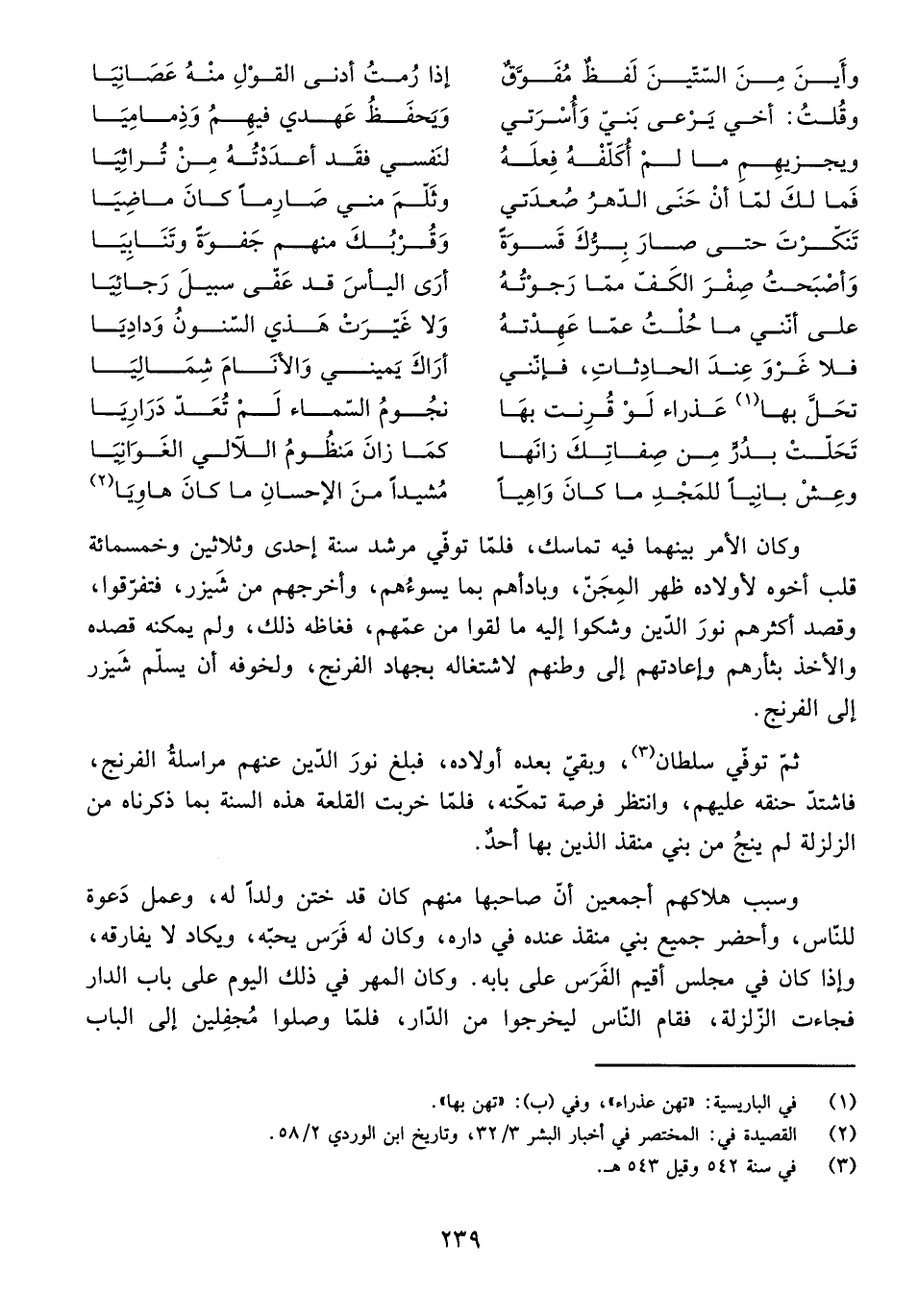 ثُمَّ تُوُفِّيَ سُلْطَانٌ وَبَقِيَ بَعْدَهُ أَوْلَادُهُ، فَبَلَغَ نُورَ الدِّينِ عَنْهُمْ مُرَاسَلَةُ الْفِرِنْجِ فَاشْتَدَّ حَنَقُهُ عَلَيْهِمْ، وَانْتَظَرَ فُرْصَةً تُمَكِّنُهُ، فَلَمَّا خَرِبَتِ الْقَلْعَةُ هَذِهِ السَّنَةَ بِمَا ذَكَرْنَاهُ مِنَ الزَّلْزَلَةِ لَمْ يَنْجُ مِنْ بَنِي مُنْقِذِ الَّذِينِ بِهَا أَحَدٌ.
