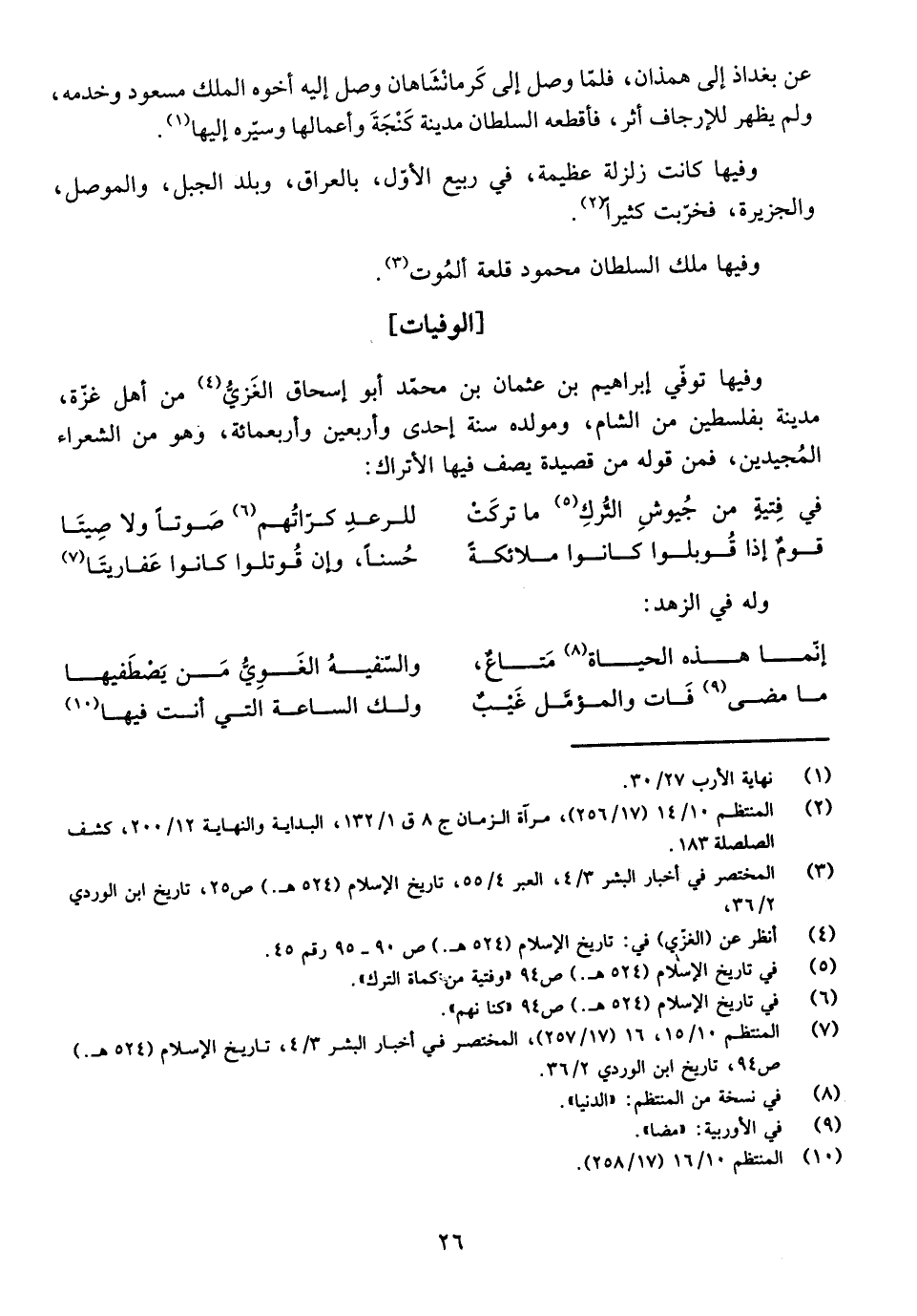 [الْوَفَيَاتُ] وَفِيهَا تُوُفِّيَ إِبْرَاهِيمُ بْنُ عُثْمَانَ بْنِ مُحَمَّدٍ أَبُو إِسْحَاقَ الْغَزِّيُّ مِنْ أَهْلِ غَزَّةَ، مَدِينَةٍ بِفِلَسْطِينَ مِنَ الشَّامِ، وَمَوْلِدُهُ سَنَةَ إِحْدَى وَأَرْبَعِينَ وَأَرْبَعِمِائَةٍ، وَهُوَ مِنَ الشُّعَرَاءِ الْمُجِيدِينَ، فَمِنْ قَوْلِهِ مِنْ قَصِيدَةٍ يَصِفُ فِيهَا الْأَتْرَاكَ: