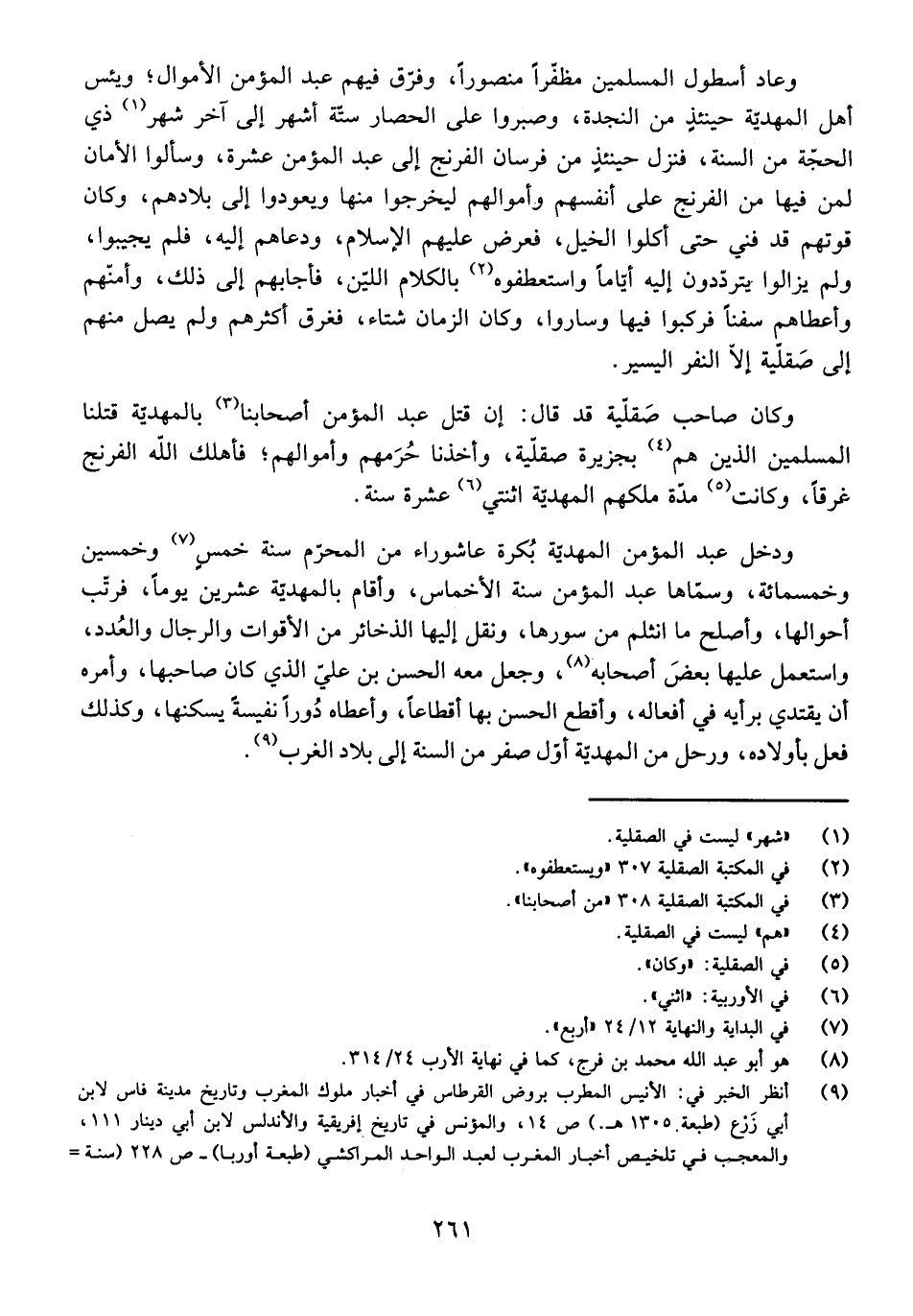 وَعَادَ أُسْطُولُ الْمُسْلِمِينَ مُظَفَّرًا مَنْصُورًا، وَفَرَّقَ فِيهِمْ عَبْدُ الْمُؤْمِنِ الْأَمْوَالَ، وَيَئِسَ أَهْلُ الْمَهْدِيَّةِ حِينَئِذٍ مِنَ النَّجْدَةِ، وَصَبَرُوا عَلَى الْحِصَارِ سِتَّةَ أَشْهُرٍ إِلَى آخِرِ شَهْرِ ذِي الْحِجَّةِ مِنَ السَّنَةِ، فَنَزَلَ حِينَئِذٍ مِنْ فُرْسَانِ الْفِرِنْجِ إِلَى عَبْدِ الْمُؤْمِنِ عَشَرَةٌ، وَسَأَلُوا الْأَمَانَ لِمَنْ فِيهَا مِنَ الْفِرِنْجِ عَلَى أَنْفُسِهِمْ وَأَمْوَالِهِمْ لِيَخْرُجُوا مِنْهَا وَيَعُودُوا إِلَى بِلَادِهِمْ، وَكَانَ قُوتُهُمْ قَدْ فَنِيَ حَتَّى أَكَلُوا الْخَيْلَ، فَعَرَضَ عَلَيْهِمُ الْإِسْلَامَ، وَدَعَاهُمْ إِلَيْهِ، فَلَمْ يُجِيبُوا، وَلَمْ يَزَالُوا يَتَرَدَّدُونَ إِلَيْهِ أَيَّامًا وَاسْتَعْطَفُوهُ بِالْكَلَامِ اللَّيِّنِ، فَأَجَابَهُمْ إِلَى ذَلِكَ، وَأَمَّنَهُمْ وَأَعْطَاهُمْ سُفُنًا، فَرَكِبُوا فِيهَا وَسَارُوا، وَكَانَ الزَّمَانُ شِتَاءً، فَغَرِقَ أَكْثَرُهُمْ وَلَمْ يَصِلْ مِنْهُمْ إِلَى صِقِلِّيَةَ إِلَّا النَّفَرُ الْيَسِيرُ.