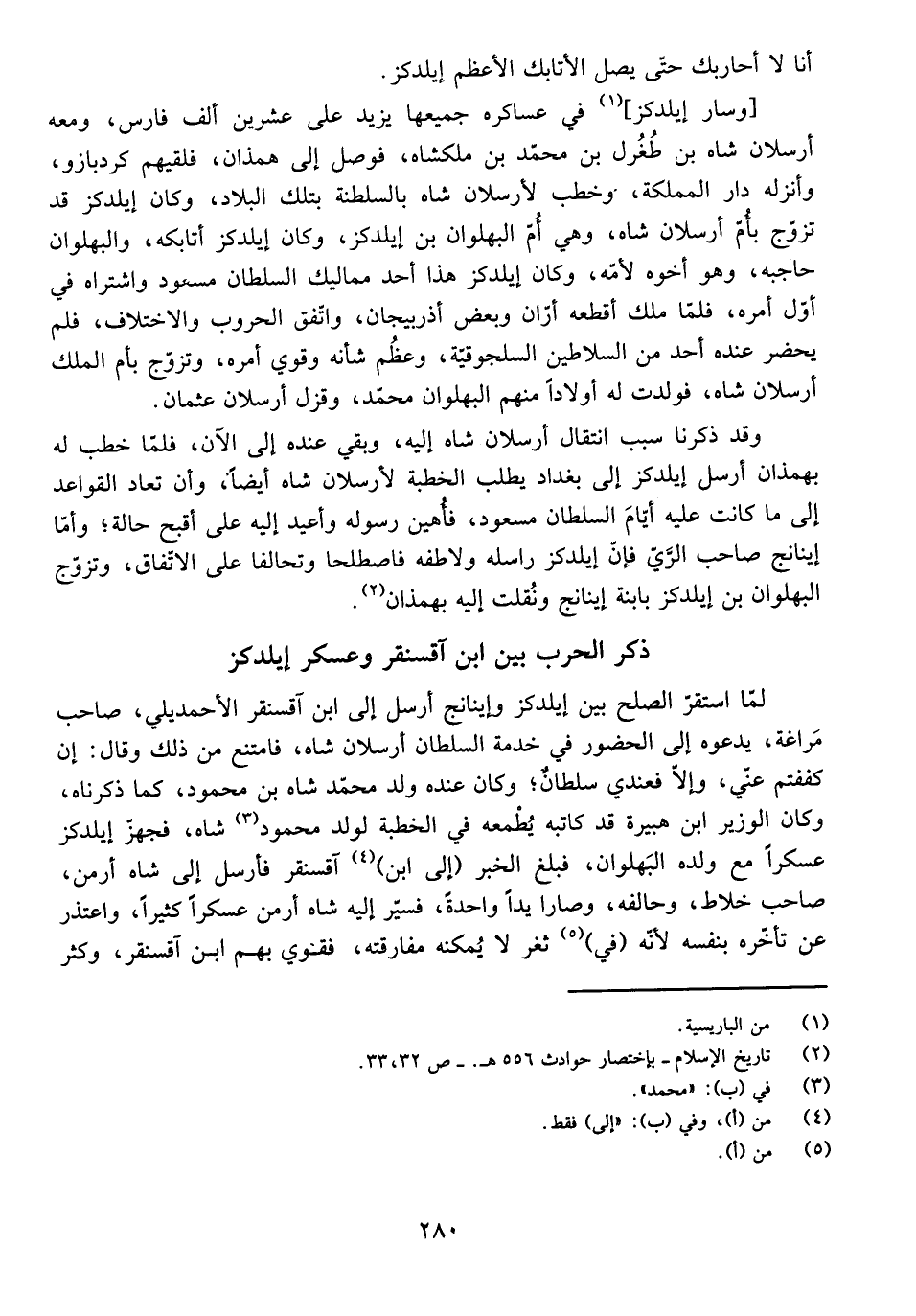 [وَسَارَ إِيلْدِكْزُ] فِي عَسَاكِرِهِ جَمِيعِهَا يَزِيدُ عَلَى عِشْرِينَ أَلْفَ فَارِسٍ، وَمَعَهُ أَرْسِلَان شَاهْ بْنُ طُغْرُلَ بْنِ مُحَمَّدِ بْنِ مَلِكْشَاهْ، فَوَصَلَ إِلَى هَمَذَانَ، فَلَقِيَهُمْ كُرْدَبَازُو، وَأَنْزَلَهُ دَارَ الْمَمْلَكَةِ، وَخَطَبَ لَأَرْسِلَان شَاهْ بِالسَّلْطَنَةِ بِتِلْكَ الْبِلَادِ، وَكَانَ إِيلْدِكْزُ قَدْ تَزَوَّجَ بِأُمِّ أَرْسِلَان شَاهْ، وَهِيَ أُمُّ الْبَهْلَوَانِ بْنِ إِيلْدِكْزَ، وَكَانَ إِيلْدِكْزُ أَتَابِكَهُ، وَالْبَهْلَوَانُ حَاجِبَهُ، وَهُوَ أَخُوهُ لِأُمِّهِ، وَكَانَ إِيلْدِكْزُ هَذَا أَحَدَ مَمَالِيكِ السُّلْطَانِ مَسْعُودِ وَاشْتَرَاهُ فِي أَوَّلِ أَمْرِهِ، فَلَمَّا مَلَكَ أَقْطَعَهُ أَرَّانَ وَبَعْضَ أَذْرَبِيجَانَ، وَاتَّفَقَ الْحُرُوبُ وَالِاخْتِلَافُ، فَلَمْ يَحْضُرْ عِنْدَهُ أَحَدٌ مِنَ السَّلَاطِينِ السَّلْجُوقِيَّةِ، وَعَظُمَ شَأْنُهُ وَقَوِيَ أَمْرُهُ، وَتَزَوَّجَ بِأُمِّ الْمَلِكِ أَرْسِلَان شَاهْ، فَوَلَدَتْ لَهُ أَوْلَادًا مِنْهُمُ الْبَهْلَوَانُ مُحَمَّدٌ، وَقُزْلُ أَرْسِلَان عُثْمَانُ.