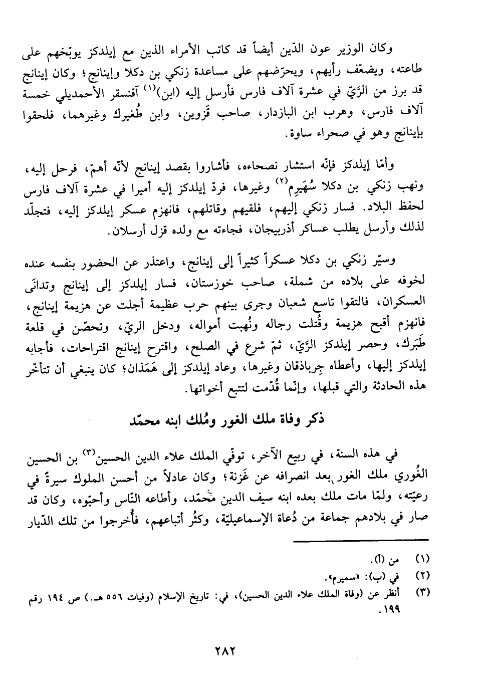 وَسَيَّرَ زَنْكِي بْنُ دَكْلَا عَسْكَرًا كَثِيرًا إِلَى إِينَانْجَ، وَاعْتَذَرَ عَنِ الْحُضُورِ بِنَفْسِهِ عِنْدَهُ لِخَوْفِهِ عَلَى بِلَادِهِ مِنْ شُمْلَةَ، صَاحِبِ خُوزَسْتَانَ، فَسَارَ إِيلْدِكْزُ إِلَى إِينَانْجَ وَتَدَانَى الْعَسْكَرَانِ، فَالْتَقَوْا تَاسِعَ شَعْبَانَ وَجَرَى بَيْنَهُمْ حَرْبٌ عَظِيمَةٌ أَجْلَتْ عَنْ هَزِيمَةِ إِينَانْجَ، فَانْهَزَمَ أَقْبَحَ هَزِيمَةٍ وَقُتِلَتْ رِجَالُهُ وَنُهِبَتْ أَمْوَالُهُ، وَدَخَلَ الرَّيَّ، وَتَحَصَّنَ فِي قَلْعَةِ طَبْرَكَ، وَحَصَرَ إِيلْدِكْزُ الرَّيَّ، ثُمَّ شَرَعَ فِي الصُّلْحِ، وَاقْتَرَحَ إِينَانْجُ اقْتِرَاحَاتٍ، فَأَجَابَهُ إِيلْدِكْزُ إِلَيْهَا، وَأَعْطَاهُ جَرْبَاذَقَانَ وَغَيْرَهَا، وَعَادَ إِيلْدِكْزُ إِلَى هَمَذَانَ، كَانَ يَنْبَغِي أَنْ تَتَأَخَّرَ هَذِهِ الْحَادِثَةُ وَالَّتِي قَبْلَهَا، وَإِنَّمَا قُدِّمَتْ لِتَتْبَعَ أَخَوَاتِهَا.