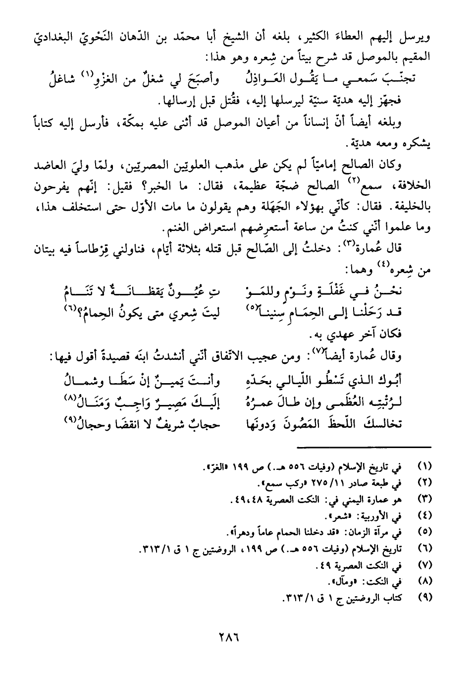 وَيُرْسِلُ إِلَيْهِمُ الْعَطَاءَ الْكَثِيرَ، بَلَغَهُ أَنَّ الشَّيْخَ أَبَا مُحَمَّدِ بْنَ الدَّهَّانِ النَّحْوِيَّ الْبَغْدَادِيَّ الْمُقَيَّمَ بِالْمَوْصِلِ قَدْ شَرَحَ بَيْتًا مِنْ شِعْرِهِ وَهُوَ هَذَا: