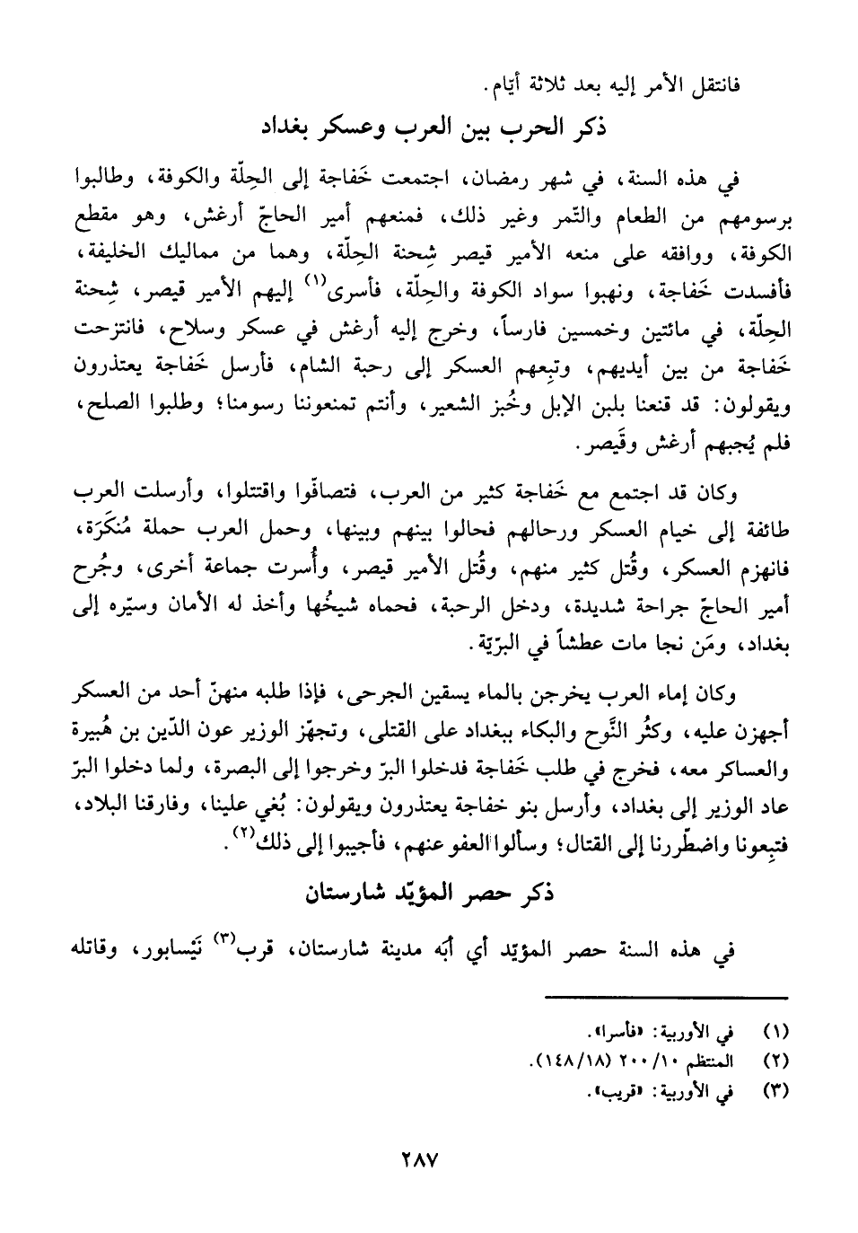 ذِكْرُ الْحَرْبِ بَيْنَ الْعَرَبِ وَعَسْكَرِ بَغْدَادَ