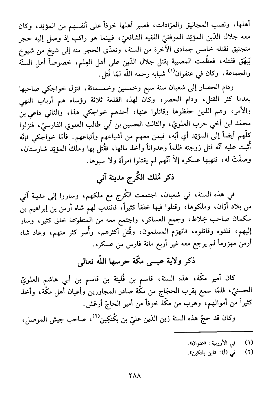 أَهْلُهَا، وَنَصَبَ الْمَجَانِيقَ وَالْعَرَّادَاتِ، فَصَبَرَ أَهْلُهَا خَوْفًا عَلَى أَنْفُسِهِمْ مِنَ الْمُؤَيَّدِ، وَكَانَ مَعَهُ جَلَالُ الدِّينِ الْمُؤَيَّدُ الْمُوَفَّقِيُّ الْفَقِيهُ الشَّافِعِيُّ، فَبَيْنَمَا هُوَ رَاكِبٌ إِذْ وَصَلَ إِلَيْهِ حَجَرُ مَنْجَنِيقٍ فَقَتَلَهُ خَامِسَ جُمَادَى الْآخِرَةِ مِنَ السَّنَةِ، وَتَعَدَّى الْحَجَرُ مِنْهُ إِلَى شَيْخٍ مِنْ شُيُوخِ بَيْهَقَ، فَقَتَلَهُ، فَعَظُمَتِ الْمُصِيبَةُ بِقَتْلِ جَلَالِ الدِّينِ عَلَى أَهْلِ الْعِلْمِ، خُصُوصًا أَهْلَ السُّنَّةِ وَالْجَمَاعَةِ، وَكَانَ فِي عُنْفُوَانِ شَبَابِهِ رَحِمَهُ اللَّهُ لَمَّا قُتِلَ.