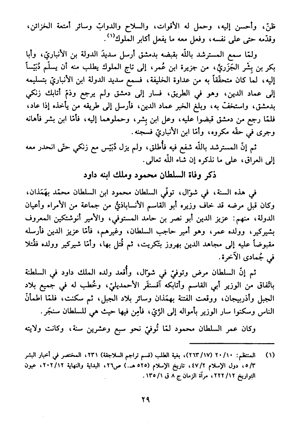 ثُمَّ إِنَّ السُّلْطَانَ مَرِضَ وَتُوُفِّيَ فِي شَوَّالٍ، وَأُقْعِدَ وَلَدَهُ دُوَادُ فِي السَّلْطَنَةِ بِاتِّفَاقٍ مِنَ الْوَزِيرِ أَبِي الْقَاسِمِ، وَأَتَابَكِهِ آقَسُنْقَرَ الْأَحْمَدِيلِيِّ، وَخُطِبَ لَهُ فِي جَمِيعِ بِلَادِ الْجَبَلِ وَأَذْرَبِيجَانَ، وَوَقَعَتِ الْفِتْنَةُ بِهَمَذَانَ وَسَائِرِ بِلَادِ الْجَبَلِ، ثُمَّ سَكَنَتْ، فَلَمَّا اطْمَأَنَّ النَّاسُ وَسَكَنُوا سَارَ الْوَزِيرُ بِأَمْوَالِهِ إِلَى الرَّيِّ، فَأَمِنَ فِيهَا حَيْثُ هِيَ لِلسُّلْطَانِ سَنْجَرَ.