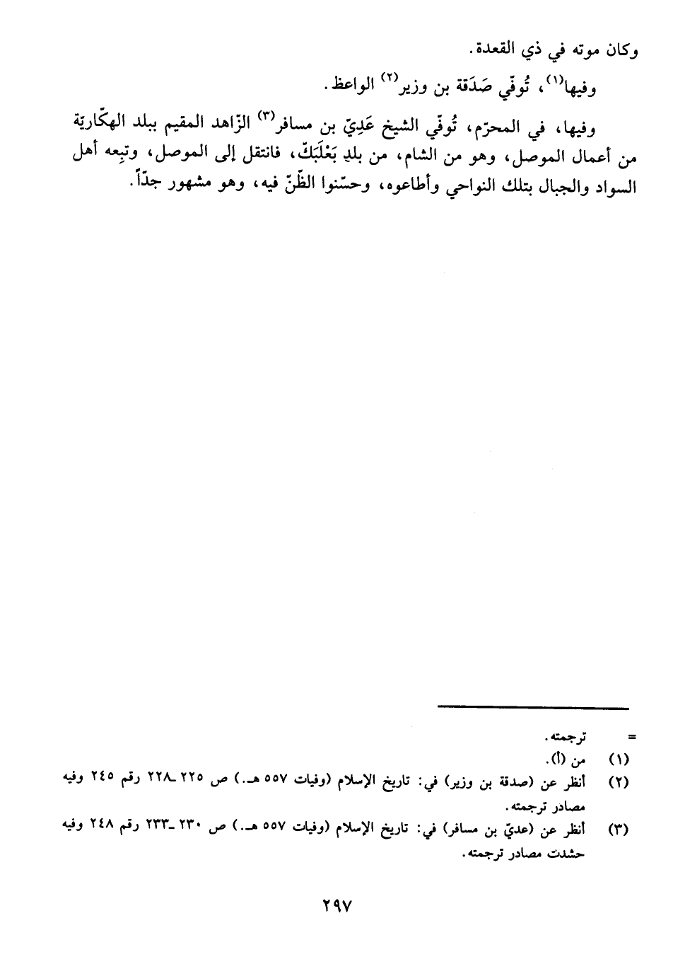 وَفِيهَا، فِي الْمُحَرَّمِ، تُوُفِّيَ الشَّيْخُ عَدِيُّ بْنُ مُسَافِرٍ الزَّاهِدُ الْمُقِيمُ بِبَلَدِ الْهَكَّارِيَّةِ مِنْ أَعْمَالِ الْمَوْصِلِ، وَهُوَ مِنَ الشَّامِ، مِنْ بَلَدِ بَعْلَبَكَّ، فَانْتَقَلَ إِلَى الْمَوْصِلِ، وَتَبِعَهُ أَهْلُ السَّوَادِ وَالْجِبَالِ بِتِلْكَ النَّوَاحِي وَأَطَاعُوهُ، وَحَسَّنُوا الظَّنَّ فِيهِ، وَهُوَ مَشْهُورٌ جِدًّا.