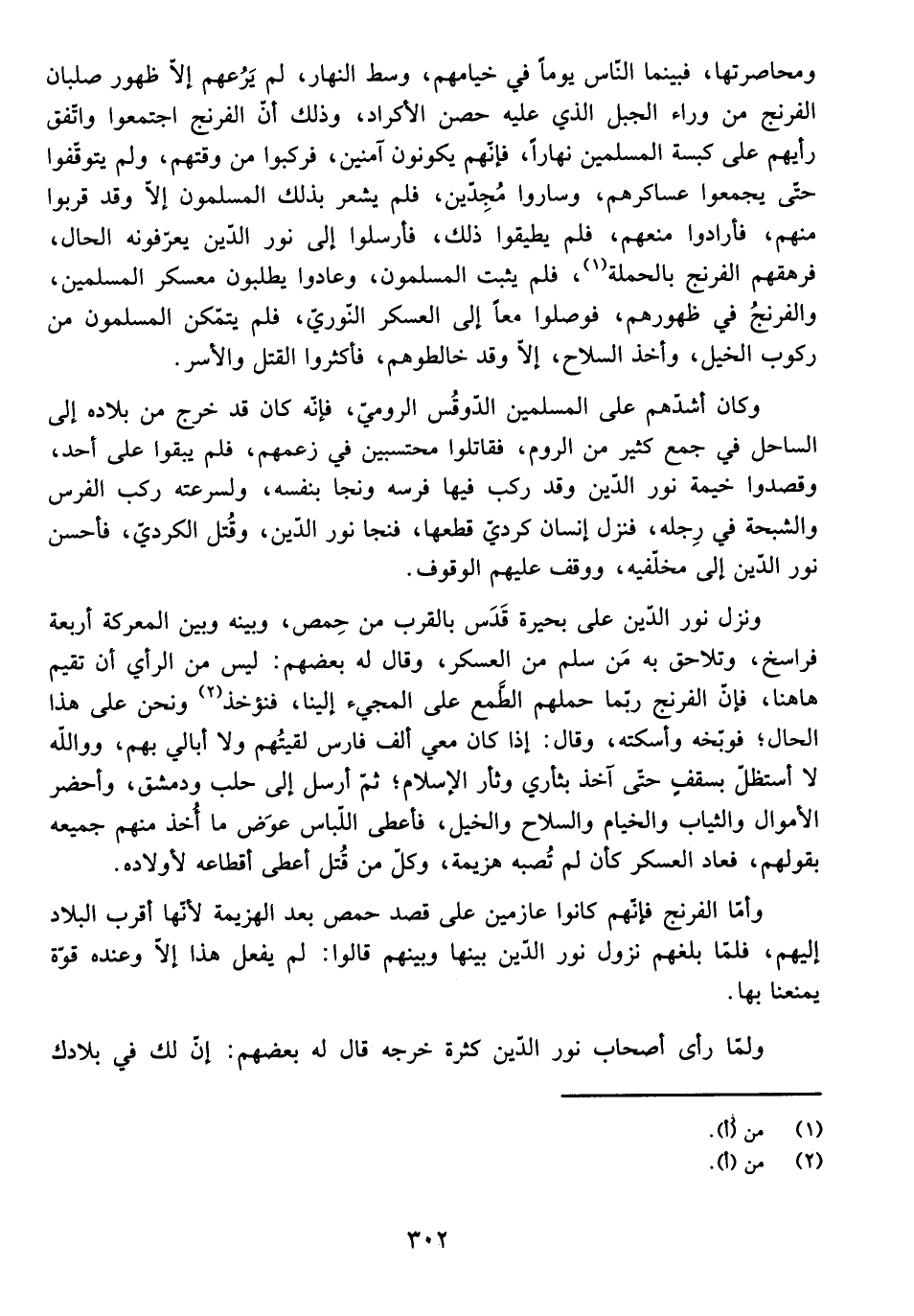 وَمُحَاصَرَتِهَا، فَبَيْنَمَا النَّاسُ يَوْمًا فِي خِيَامِهِمْ، وَسَطَ النَّهَارِ، لَمْ يَرُعْهُمْ إِلَّا ظُهُورُ صُلْبَانِ الْفِرِنْجِ مِنْ وَرَاءِ الْجَبَلِ الَّذِي عَلَيْهِ حِصْنُ الْأَكْرَادِ، وَذَلِكَ أَنَّ الْفِرِنْجَ اجْتَمَعُوا وَاتَّفَقَ رَأْيُهُمْ عَلَى كَبْسَةِ الْمُسْلِمِينَ نَهَارًا، فَإِنَّهُمْ يَكُونُونَ آمِنِينَ، فَرَكِبُوا مِنْ وَقْتِهِمْ، وَلَمْ يَتَوَقَّفُوا حَتَّى يَجْمَعُوا عَسَاكِرَهُمْ، وَسَارُوا مُجِدِّينَ، فَلَمْ يَشْعُرْ بِذَلِكَ الْمُسْلِمُونَ إِلَّا وَقَدْ قَرُبُوا مِنْهُمْ، فَأَرَادُوا مَنْعَهُمْ، فَلَمْ يُطِيقُوا ذَلِكَ، فَأَرْسَلُوا إِلَى نُورِ الدِّينِ يُعَرِّفُونَهُ الْحَالَ، فَرَهِقَهُمُ الْفِرِنْجُ بِالْحَمْلَةِ، فَلَمْ يَثْبُتِ الْمُسْلِمُونَ، وَعَادُوا يَطْلُبُونَ مُعَسْكَرَ الْمُسْلِمِينَ، وَالْفِرِنْجُ فِي ظُهُورِهِمْ، فَوَصَلُوا مَعًا إِلَى الْعَسْكَرِ النُّورِيِّ، فَلَمْ يَتَمَكَّنِ الْمُسْلِمُونَ مِنْ رُكُوبِ الْخَيْلِ، وَأَخْذِ السِّلَاحِ إِلَّا وَقَدْ خَالَطُوهُمْ، فَأَكْثَرُوا الْقَتْلَ وَالْأَسْرَ.
