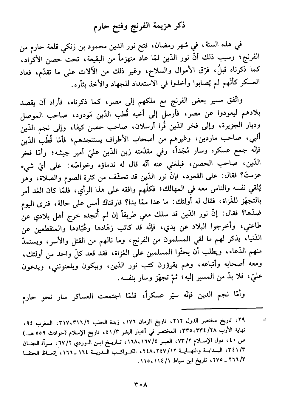 وَاتَّفَقَ مَسِيرُ بَعْضِ الْفِرِنْجِ مَعَ مَلِكِهِمْ إِلَى مِصْرَ، كَمَا ذَكَرْنَاهُ، فَأَرَادَ أَنْ يَقْصِدَ بِلَادَهُمْ لِيَعُودُوا عَنْ مِصْرَ، فَأَرْسَلَ إِلَى أَخِيهِ قُطْبِ الدِّينِ مَوْدُودٍ، صَاحِبِ الْمَوْصِلِ وَدِيَارِ الْجَزِيرَةِ، وَإِلَى فَخْرِ الدِّينِ قُرَا أَرْسِلَان، صَاحِبِ حِصْنِ كَيْفَا، وَإِلَى نَجْمِ الدِّينِ أَلْبِي، صَاحِبِ مَارِدِينَ، وَغَيْرِهِمْ مِنْ أَصْحَابِ الْأَطْرَافِ يَسْتَنْجِدُهُمْ، فَأَمَّا قُطْبُ الدِّينِ فَإِنَّهُ جَمَعَ عَسْكَرَهُ وَسَارَ مُجِدًّا، وَفِي مُقَدِّمَتِهِ زَيْنُ الدِّينِ عَلِيٌّ أَمِيرُ جَيْشِهِ، وَأَمَّا فَخْرُ الدِّينِ، صَاحِبُ الْحِصْنِ، فَبَلَغَنِي عَنْهُ أَنَّهُ قَالَ لَهُ نُدَمَاؤُهُ وَخَوَاصُّهُ: عَلَى أَيِّ شَيْءٍ عَزَمْتَ؟ فَقَالَ: عَلَى الْقُعُودِ، فَإِنَّ نُورَ الدِّينِ قَدْ تَحَشَّفَ مِنْ كَثْرَةِ الصَّوْمِ وَالصَّلَاةِ، وَهُوَ يُلْقِي نَفْسَهُ وَالنَّاسَ مَعَهُ فِي الْمَهَالِكِ، فَكُلُّهُمْ وَافَقَهُ عَلَى هَذَا الرَّأْيِ، فَلَمَّا كَانَ الْغَدُ أَمَرَ بِالتَّجَهُّزِ لِلْغُزَاةِ، فَقَالَ لَهُ أُولَئِكَ: مَا عَدَا مِمَّا بَدَا؟ فَارَقْنَاكَ أَمْسِ عَلَى حَالَةٍ، فَنَرَى الْيَوْمَ ضِدَّهَا؟ فَقَالَ: إِنَّ نُورَ الدِّينِ قَدْ سَلَكَ مَعِي طَرِيقًا إِنْ لَمْ أُنْجِدْهُ خَرَجَ أَهْلُ بِلَادِي عَنْ طَاعَتِي، وَأَخْرَجُوا الْبِلَادَ عَنْ يَدِي، فَإِنَّهُ قَدْ كَاتَبَ زُهَّادَهَا وَعُبَّادَهَا وَالْمُنْقَطِعِينَ عَنِ الدُّنْيَا، يَذْكُرُ لَهُمْ مَا لَقِيَ الْمُسْلِمُونَ مِنَ الْفِرِنْجِ، وَمَا نَالَهُمْ مِنَ الْقَتْلِ وَالْأَسْرِ، وَيَسْتَمِدُّ مِنْهُمُ الدُّعَاءَ، وَيَطْلُبُ أَنْ يَحُثُّوا الْمُسْلِمِينَ عَلَى الْغَزَاةِ، فَقَدْ قَعَدَ كُلُّ وَاحِدٍ مِنْ أُولَئِكَ، وَمَعَهُ أَصْحَابُهُ وَأَتْبَاعُهُ، وَهُمْ يَقْرَؤُوَنَ كُتُبَ نُورِ الدِّينِ، وَيَبْكُونَ وَيَلْعَنُونَنِي، وَيَدْعُونَ عَلَيَّ، فَلَا بُدَّ مِنَ الْمَسِيرِ إِلَيْهِ، ثُمَّ تَجَهَّزَ وَسَارَ بِنَفْسِهِ.