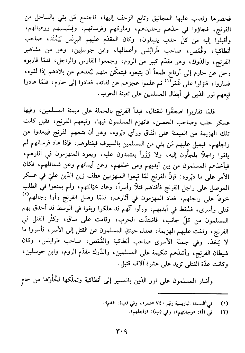 فَحَصَرَهَا، وَنَصَبَ عَلَيْهَا الْمَجَانِيقَ، وَتَابَعَ الزَّحْفَ إِلَيْهَا، فَاجْتَمَعَ مَنْ بَقِيَ بِالسَّاحِلِ مِنَ الْفِرِنْجِ، فَجَاءُوا فِي حَدِّهِمْ وَحَدِيدِهِمْ، وَمُلُوكِهِمْ وَفُرْسَانِهِمْ، وَقِسِّيسِيهِمْ، وَرُهْبَانِهِمْ، وَأَقْبَلُوا إِلَيْهِ مِنْ كُلِّ حَدَبٍ يَنْسِلُونَ، وَكَانَ الْمُقَدَّمُ عَلَيْهِمُ الْبِرِنْسَ بَيْمُنْدَ، صَاحِبَ أَنْطَاكِيَةَ، وَقُمَّصُ، صَاحِبُ طَرَابُلُسَ وَأَعْمَالِهَا، وَابْنُ جُوسَلِينَ، وَهُوَ مِنْ مَشَاهِيرِ الْفِرِنْجِ، وَالدُّوكِ، وَهُوَ مُقَدَّمٌ كَبِيرٌ مِنَ الرُّومِ، وَجَمَعُوا الْفَارِسَ وَالرَّاجِلَ، فَلَمَّا قَارَبُوهُ رَحَلَ عَنْ حَارِمَ إِلَى أَرْتَاحَ طَمَعًا أَنْ يَتْبَعُوهُ، فَيَتَمَكَّنَ مِنْهُمْ ; لِبُعْدِهِمْ عَنْ بِلَادِهِمْ إِذَا لَقُوهُ، فَسَارُوا، فَنَزَلُوا عَلَى غَمَّرَ، ثُمَّ عَلِمُوا عَجْزَهُمْ عَنْ لِقَائِهِ، فَعَادُوا إِلَى حَارِمَ، فَلَمَّا عَادُوا تَبِعَهُمْ نُورُ الدِّينِ فِي أَبْطَالِ الْمُسْلِمِينَ عَلَى تَعْبِئَةِ الْحَرْبِ.