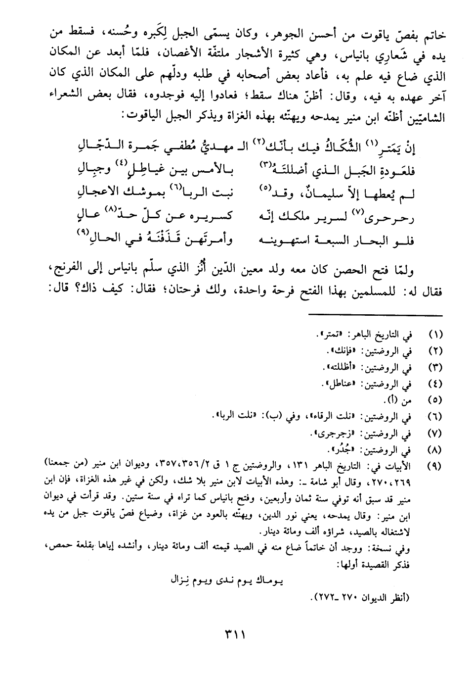 خَاتَمٌ بِفَصِّ يَاقُوتٍ مِنْ أَحْسَنِ الْجَوْهَرِ، وَكَانَ يُسَمَّى الْجَبَلُ لِكِبَرِهِ وَحُسْنِهِ، فَسَقَطَ مِنْ يَدِهِ فِي شِعَارِي بَانِيَاسَ، وَهِيَ كَثِيرَةُ الْأَشْجَارِ مُلْتَفَّةَ الْأَغْصَانِ، فَلَمَّا أَبْعَدَ عَنِ الْمَكَانِ الَّذِي ضَاعَ فِيهِ عَلِمَ بِهِ، فَأَعَادَ بَعْضَ أَصْحَابِهِ فِي طَلَبِهِ، وَدَلَّهُمْ عَلَى الْمَكَانِ الَّذِي كَانَ آخِرَ عَهْدِهِ بِهِ فِيهِ، وَقَالَ: أَظُنُّ هُنَاكَ سَقَطَ، فَعَادُوا إِلَيْهِ، فَوَجَدُوهُ، فَقَالَ بَعْضُ الشُّعَرَاءِ الشَّامِيِّينَ أَظُنُّهُ ابْنَ مُنِيرٍ يَمْدَحُهُ، وَيُهَنِّئُهُ بِهَذِهِ الْغَزَاةِ، وَيَذْكُرُ الْجَبَلَ الْيَاقُوتَ: