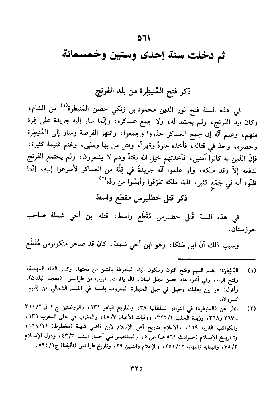 فِي هَذِهِ السَّنَةِ فَتَحَ نُورُ الدِّينِ مَحْمُودُ بْنُ زَنْكِي حِصْنَ الْمُنَيْطِرَةِ مِنَ الشَّامِ، وَكَانَ بِيَدِ الْفِرِنْجِ، وَلَمْ يَحْشُدْ لَهُ، وَلَا جَمَعَ عَسَاكِرَهُ، وَإِنَّمَا سَارَ إِلَيْهِ جَرِيدَةً عَلَى غِرَّةٍ مِنْهُمْ، وَعَلِمَ أَنَّهُ إِنْ جَمَعَ الْعَسَاكِرَ حَذِرُوا وَجَمَعُوا، وَانْتَهَزَ الْفُرْصَةَ وَسَارَ إِلَى الْمُنَيْطِرَةِ وَحَصَرَهُ، وَجَدَّ فِي قِتَالِهِ، فَأَخَذَهُ عَنْوَةً وَقَهْرًا، وَقَتَلَ مَنْ بِهَا وَسَبَى، وَغَنِمَ غَنِيمَةً كَثِيرَةً، فَإِنَّ الَّذِينَ بِهِ كَانُوا آمِنِينَ، فَأَخَذَتْهُمْ خَيْلُ اللَّهِ بَغْتَةً وَهُمْ لَا يَشْعُرُونَ، وَلَمْ يَجْتَمِعِ الْفِرِنْجُ لِدَفْعِهِ إِلَّا وَقَدْ مَلَكَهُ، وَلَوْ عَلِمُوا أَنَّهُ جَرِيدَةٌ فِي قِلَّةٍ مِنَ الْعَسَاكِرِ لَأَسْرَعُوا إِلَيْهِ، إِنَّمَا ظَنُّوهُ أَنَّهُ فِي جَمْعٍ كَثِيرٍ. فَلَمَّا مَلَكَهُ تَفَرَّقُوا وَأَيِسُوا مِنْ رَدِّهِ.