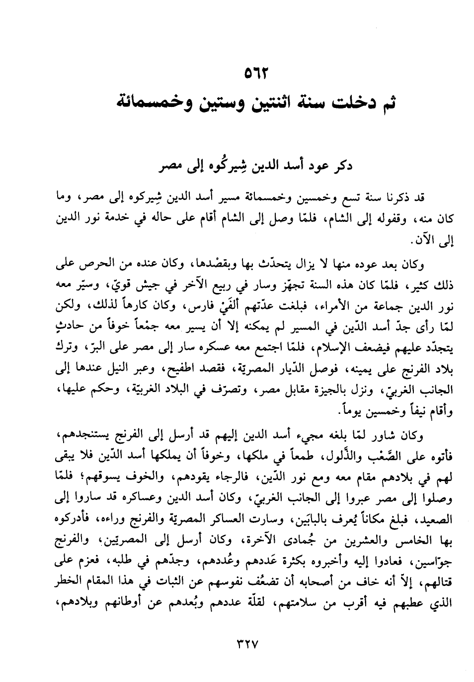 وَكَانَ بَعْدَ عَوْدِهِ مِنْهَا لَا يَزَالُ يَتَحَدَّثُ بِهَا وَبِقَصْدِهَا، وَكَانَ عِنْدَهُ مِنَ الْحِرْصِ عَلَى ذَلِكَ كَثِيرٌ، فَلَمَّا كَانَ هَذِهِ السَّنَةَ تَجَهَّزَ وَسَارَ فِي رَبِيعٍ الْآخِرِ فِي جَيْشٍ قَوِيٍّ، وَسَيَّرَ مَعَهُ نُورُ الدِّينِ جَمَاعَةً مِنَ الْأُمَرَاءِ، فَبَلَغَتْ عِدَّتُهُمْ أَلْفَيْ فَارِسٍ، وَكَانَ كَارِهًا لِذَلِكَ، وَلَكِنْ لَمَّا رَأَى جِدَّ أَسَدِ الدِّينِ فِي الْمَسِيرِ لَمْ يُمْكِنْهُ إِلَّا أَنْ يُسَيِّرَ مَعَهُ جَمْعًا خَوْفًا مِنْ حَادِثٍ يَتَجَدَّدُ عَلَيْهِمْ، فَيَضْعُفُ الْإِسْلَامَ، فَلَمَّا اجْتَمَعَ مَعَهُ عَسْكَرُهُ سَارَ إِلَى مِصْرَ عَلَى الْبَرِّ، وَتَرَكَ بِلَادَ الْفِرِنْجِ عَلَى يَمِينِهِ، فَوَصَلَ الدِّيَارَ الْمِصْرِيَّةَ، فَقَصَدَ إِطْفِيحَ، وَعَبَرَ النِّيلَ عِنْدَهَا إِلَى الْجَانِبِ الْغَرْبِيِّ، وَنَزَلَ بِالْجِيزَةِ مُقَابِلَ مِصْرَ، وَتَصَرَّفَ فِي الْبِلَادِ الْغَرْبِيَّةِ، وَحَكَمَ عَلَيْهَا، وَأَقَامَ نَيِّفًا وَخَمْسِينَ يَوْمًا.