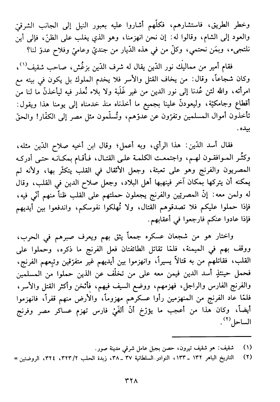 فَقَامَ أَمِيرٌ مِنْ مَمَالِيكِ نُورِ الدِّينِ يُقَالُ لَهُ شَرَفُ الدِّينِ بَزْغُشُ، صَاحِبُ شَقِيفَ، وَكَانَ شُجَاعًا، وَقَالَ: مَنْ يَخَافُ الْقَتْلَ وَالْأَسْرَ فَلَا يَخْدِمُ الْمُلُوكَ بَلْ يَكُونُ فِي بَيْتِهِ مَعَ امْرَأَتِهِ، وَاللَّهِ لَئِنْ عُدْنَا إِلَى نُورِ الدِّينِ مِنْ غَيْرِ غَلَبَةٍ وَلَا بَلَاءٍ نُعْذَرُ فِيهِ لِيَأْخُذَنَّ مَا لَنَا مِنْ أَقْطَاعٍ وَجَامِكِيَّةٍ، وَلَيَعُودَنَّ عَلَيْنَا بِجَمِيعِ مَا أَخَذْنَاهُ مُنْذُ خَدَمْنَاهُ إِلَى يَوْمِنَا هَذَا، وَيَقُولُ: تَأْخُذُونَ أَمْوَالَ الْمُسْلِمِينَ وَتَفِرُّونَ عَنْ عَدُوِّهِمْ، وَتُسَلِّمُونَ مِثْلَ مِصْرَ إِلَى الْكُفَّارِ! وَالْحَقُّ بِيَدِهِ.
