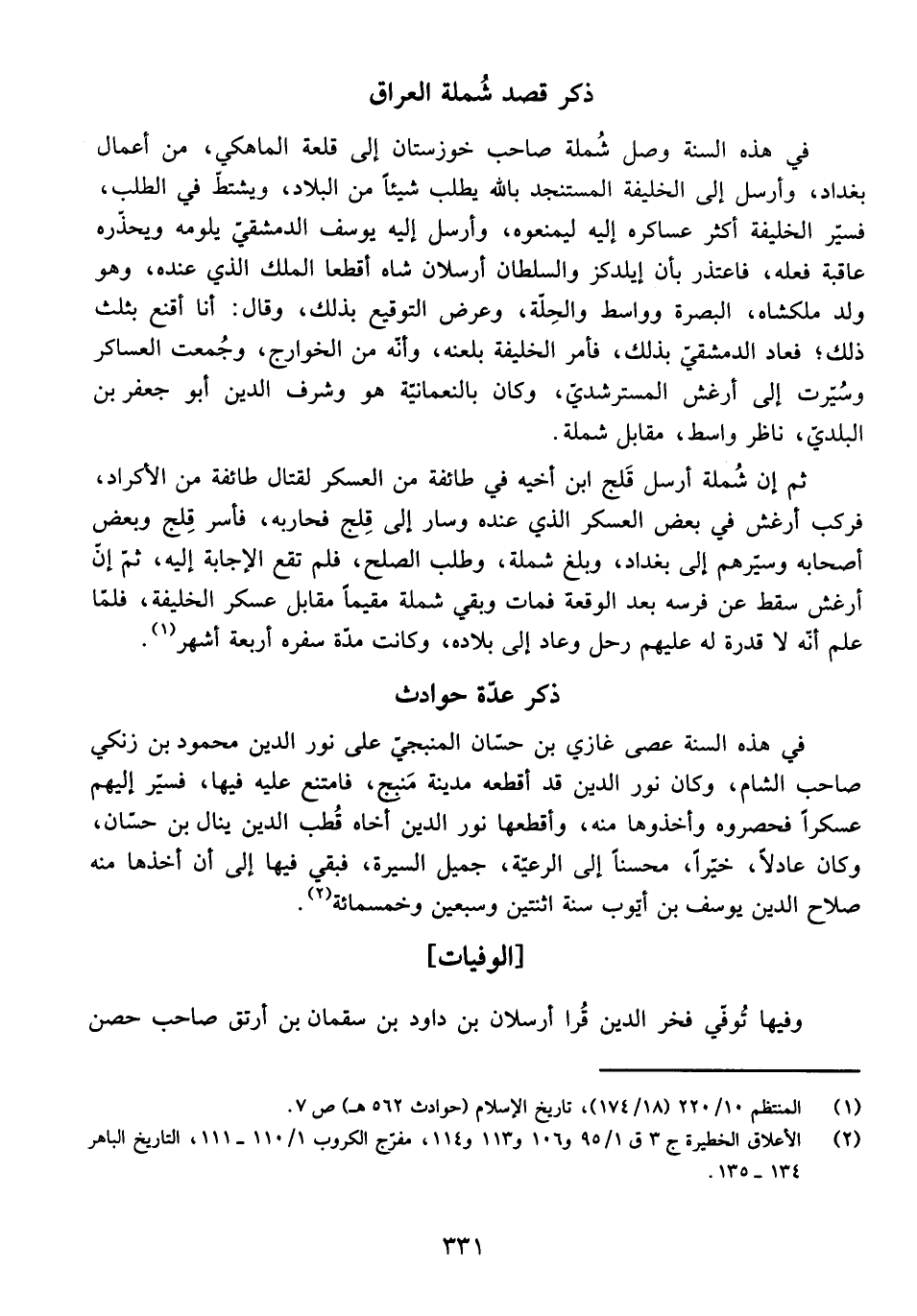 فِي هَذِهِ السَّنَةِ وَصَلَ شُمْلَةُ صَاحِبُ خُوزَسْتَانَ إِلَى قَلْعَةِ الْمَاهِكِيِّ، مِنْ أَعْمَالِ بَغْدَادَ، وَأَرْسَلَ إِلَى الْخَلِيفَةِ الْمُسْتَنْجِدِ بِاللَّهِ يَطْلُبُ شَيْئًا مِنَ الْبِلَادِ، وَيَشْتَطُّ فِي الطَّلَبِ، فَسَيَّرَ الْخَلِيفَةُ أَكْثَرَ عَسَاكِرِهِ إِلَيْهِ ; لِيَمْنَعُوهُ، وَأَرْسَلَ إِلَيْهِ يُوسُفَ الدِّمَشْقِيَّ يَلُومُهُ، وَيُحَذِّرُهُ عَاقِبَةَ فِعْلِهِ، فَاعْتَذَرَ بِأَنَّ إِيلْدِكْزَ وَالسُّلْطَانَ أَرْسِلَان شَاهْ أَقْطَعَا الْمَلِكَ الَّذِي عِنْدَهُ، وَهُوَ وَلَدُ مَلِكْشَاهْ، الْبَصْرَةَ وَوَاسِطًا وَالْحِلَّةَ، وَعَرَضَ التَّوْقِيعَ بِذَلِكَ، وَقَالَ: أَنَا أَقْنَعُ بِثُلُثِ ذَلِكَ، فَعَادَ الدِّمَشْقِيُّ بِذَلِكَ، فَأَمَرَ الْخَلِيفَةُ بَلَعْنِهِ، وَأَنَّهُ مِنَ الْخَوَارِجِ، وَجُمِعَتِ الْعَسَاكِرُ وَسُيَّرَتِ إِلَى أَرَغْشَ الْمُسْتَرْشِدِيِّ، وَكَانَ بِالنُّعْمَانِيَّةِ هُوَ وَشَرَفُ الدِّينِ أَبُو جَعْفَرِ بْنُ الْبَلَدِيِّ، نَاظِرُ وَاسِطٍ، مُقَابِلَ شُمْلَةَ.