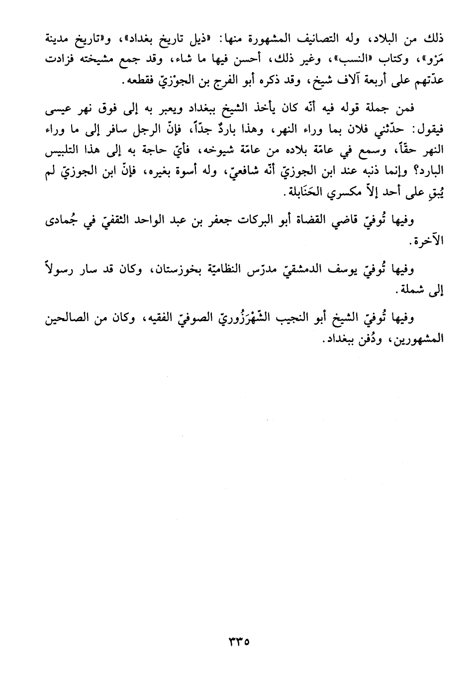 فَمِنْ جُمْلَةِ قَوْلِهِ فِيهِ أَنَّهُ كَانَ يَأْخُذُ الشَّيْخَ بِبَغْدَادَ وَيَعْبُرُ بِهِ إِلَى فَوْقِ نَهْرِ عِيسَى، فَيَقُولُ: حَدَّثَنِي فُلَانٌ بِمَا وَرَاءَ النَّهْرِ، وَهَذَا بَارِدٌ جِدًّا، فَإِنَّ الرَّجُلَ سَافَرَ إِلَى مَا وَرَاءَ النَّهْرِ حَقًّا، وَسَمِعَ فِي عَامَّةِ بِلَادِهِ مِنْ عَامَّةِ شُيُوخِهِ، فَأَيُّ حَاجَةٍ بِهِ إِلَى هَذَا التَّلْبِيسِ الْبَارِدِ؟ وَإِنَّمَا ذَنْبُهُ عِنْدَ ابْنِ الْجَوْزِيِّ أَنَّهُ شَافِعِيٌّ، وَلَهُ أُسْوَةٌ بِغَيْرِهِ، فَإِنَّ ابْنَ الْجَوْزِيِّ لَمْ يُبْقِ عَلَى أَحَدٍ إِلَّا مُكَسِّرِي الْحَنَابِلَةِ.