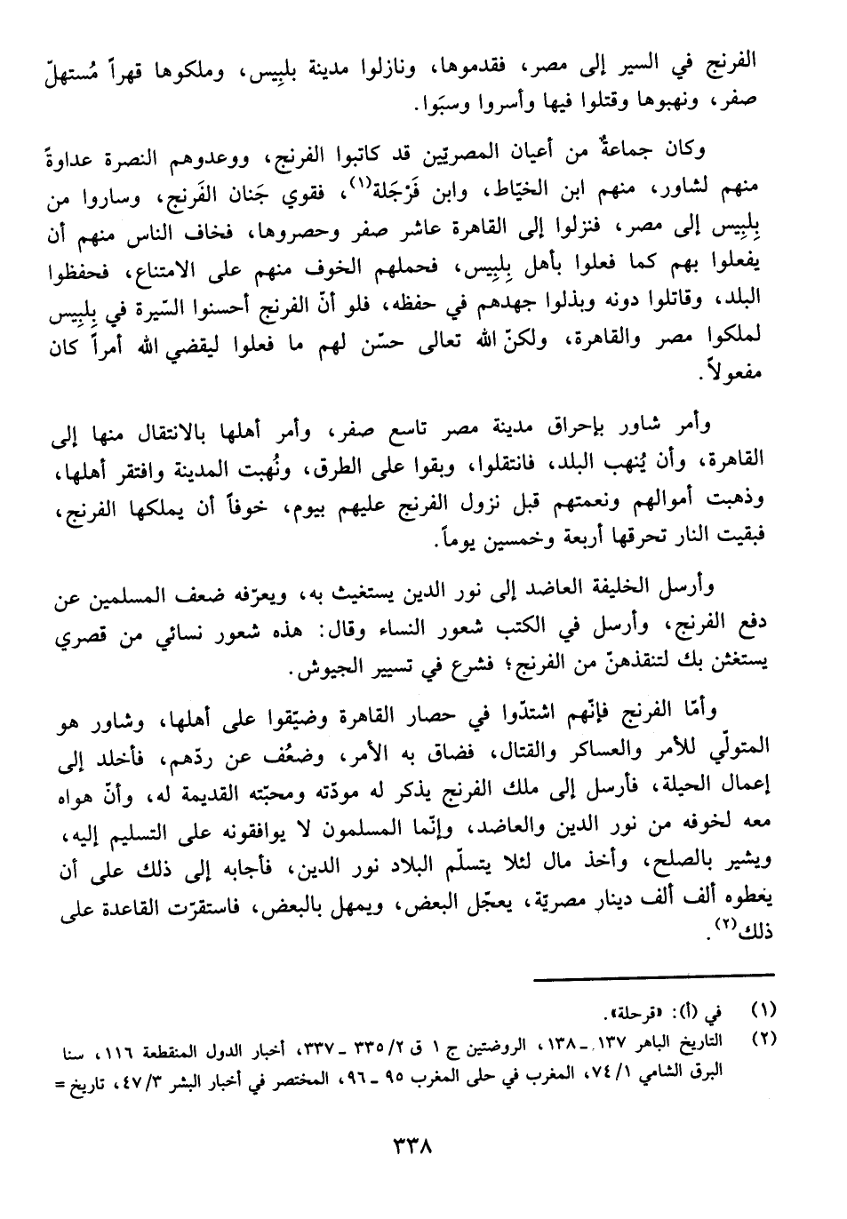 وَأَمَّا الْفِرِنْجُ فَإِنَّهُمُ اشْتَدُّوا فِي حِصَارِ الْقَاهِرَةِ وَضَيَّقُوا عَلَى أَهْلِهَا، وَشَاوُرُ هُوَ الْمُتَوَلِّي لِلْأَمْرِ وَالْعَسَاكِرِ وَالْقَتَّالِ، فَضَاقَ بِهِ الْأَمْرُ، وَضَعُفَ عَنْ رَدِّهِمْ، فَأَخَذَ إِلَى إِعْمَالِ الْحِيلَةِ، فَأَرْسَلَ إِلَى مَلِكِ الْفِرِنْجِ يَذْكُرُ لَهُ مَوَدَّتَهُ وَمَحَبَّتَهُ الْقَدِيمَةَ لَهُ، وَأَنَّ هَوَاهُ مَعَهُ ; لِخَوْفِهِ مِنْ نُورِ الدِّينِ وَالْعَاضِدِ، وَإِنَّمَا الْمُسْلِمُونَ لَا يُوَافِقُونَهُ عَلَى التَّسْلِيمِ إِلَيْهِ، وَيُشِيرُ بِالصُّلْحِ، وَأَخْذِ مَالٍ لِئَلَّا يَتَسَلَّمَ الْبِلَادَ نُورُ الدِّينِ، فَأَجَابَهُ إِلَى ذَلِكَ عَلَى أَنْ يُعْطُوهُ أَلْفَ أَلْفِ دِينَارٍ مِصْرِيَّةٍ، يُعَجِّلُ الْبَعْضَ، وَيُمْهِلُ بِالْبَعْضِ، فَاسْتَقَرَّتِ الْقَاعِدَةُ عَلَى ذَلِكَ.