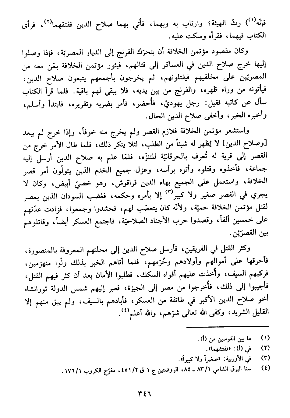 وَكَانَ مَقْصُودُ مُؤْتَمَنِ الْخِلَافَةِ أَنْ يَتَحَرَّكَ الْفِرِنْجُ إِلَى الدِّيَارِ الْمِصْرِيَّةِ، فَإِذَا وَصَلُوا إِلَيْهَا خَرَجَ صَلَاحُ الدِّينِ فِي الْعَسَاكِرِ إِلَى قِتَالِهِمْ، فَيَثُورُ مُؤْتَمَنُ الْخِلَافَةِ بِمَنْ مَعَهُ مِنَ الْمِصْرِيِّينَ عَلَى مُخَلَّفِيهِمْ فَيَقْتُلُونَهُمْ، ثُمَّ يَخْرُجُونَ بِأَجْمَعِهِمْ يَتَّبِعُونَ صَلَاحَ الدِّينِ، فَيَأْتُونَهُ مِنْ وَرَاءِ ظَهْرِهِ، وَالْفِرِنْجُ مِنْ بَيْنِ يَدَيْهِ، فَلَا يَبْقَى لَهُمْ بَاقِيَةٌ، فَلَمَّا قَرَأَ الْكِتَابَ سَأَلَ عَنْ كَاتِبِهِ، فَقِيلَ: رَجُلٌ يَهُودِيٌّ، فَأُحْضِرَ، فَأَمَرَ بِضَرْبِهِ وَتَقْرِيرِهِ، فَابْتَدَأَ وَأَسْلَمَ، وَأَخْبَرَهُ الْخَبَرَ، وَأَخْفَى صَلَاحُ الدِّينِ الْحَالَ.