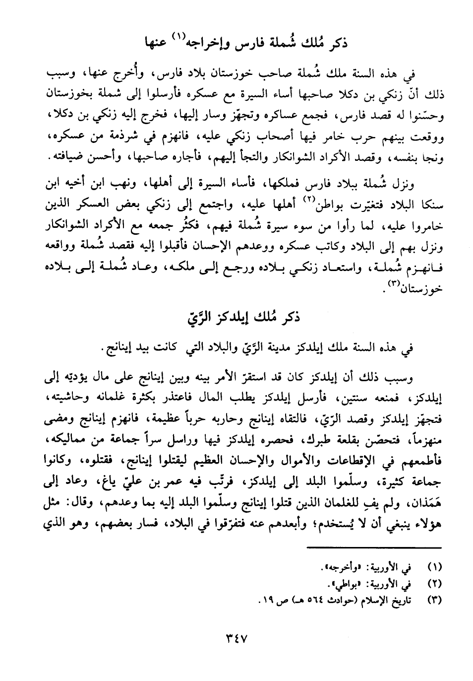 فِي هَذِهِ السَّنَةِ مَلَكَ شُمْلَةُ صَاحِبُ خُوزَسْتَانَ بِلَادَ فَارِسَ، وَأُخْرِجَ عَنْهَا، وَسَبَبُ ذَلِكَ أَنَّ زَنْكِي بْنَ دَكْلَا صَاحِبَهَا أَسَاءَ السِّيرَةَ مَعَ عَسْكَرِهِ، فَأَرْسَلُوا إِلَى شُمْلَةَ بِخُوزَسْتَانَ وَحَسَّنُوا لَهُ قَصْدَ فَارِسَ، فَجَمَعَ عَسَاكِرَهُ وَتَجَهَّزَ، وَسَارَ إِلَيْهَا، فَخَرَجَ إِلَيْهِ زَنْكِي بْنُ دَكْلَا، وَوَقَعَتْ بَيْنَهُمْ حَرْبٌ خَامَرَ فِيهَا أَصْحَابُ زَنْكِي عَلَيْهِ، فَانْهَزَمَ فِي شِرْذِمَةٍ مِنْ عَسْكَرِهِ، وَنَجَا بِنَفْسِهِ، وَقَصَدَ الْأَكْرَادَ الشُّوَانْكَارَ وَالْتَجَأَ إِلَيْهِمْ، فَأَجَارَهُ صَاحِبُهَا، وَأَحْسَنَ ضِيَافَتَهُ.