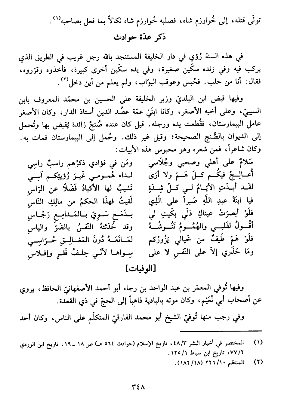 وَفِيهَا قَبَضَ ابْنُ الْبَلَدِيِّ وَزِيرُ الْخَلِيفَةِ عَلَى الْحُسَيْنِ بْنِ مُحَمَّدٍ الْمَعْرُوفِ بِابْنِ السَّيْبِيِّ، وَعَلَى أَخِيهِ الْأَصْغَرِ، وَكَانَا ابْنَيْ عَمَّةِ عَضُدِ الدِّينِ أُسْتَاذِ الدَّارِ، وَكَانَ الْأَصْغَرُ عَامِلَ الْبَيْمَارَسْتَانِ، فَقُطِعَتْ يَدُهُ وَرِجْلُهُ، قِيلَ كَانَ عِنْدَهُ صُنُجٌ زَائِدَةٌ يَقْبِضُ بِهَا وَتَحْمِلُ إِلَى الدِّيوَانِ بِالصُنُجِ الصَّحِيحَةِ، وَقِيلَ غَيْرُ ذَلِكَ، وَحُمِلَ إِلَى الْبِيمَارَسْتَانِ، فَمَاتَ بِهِ، وَكَانَ شَاعِرًا، فَمِنْ شِعْرِهِ وَهُوَ مَحْبُوسٌ هَذِهِ الْأَبْيَاتُ:
