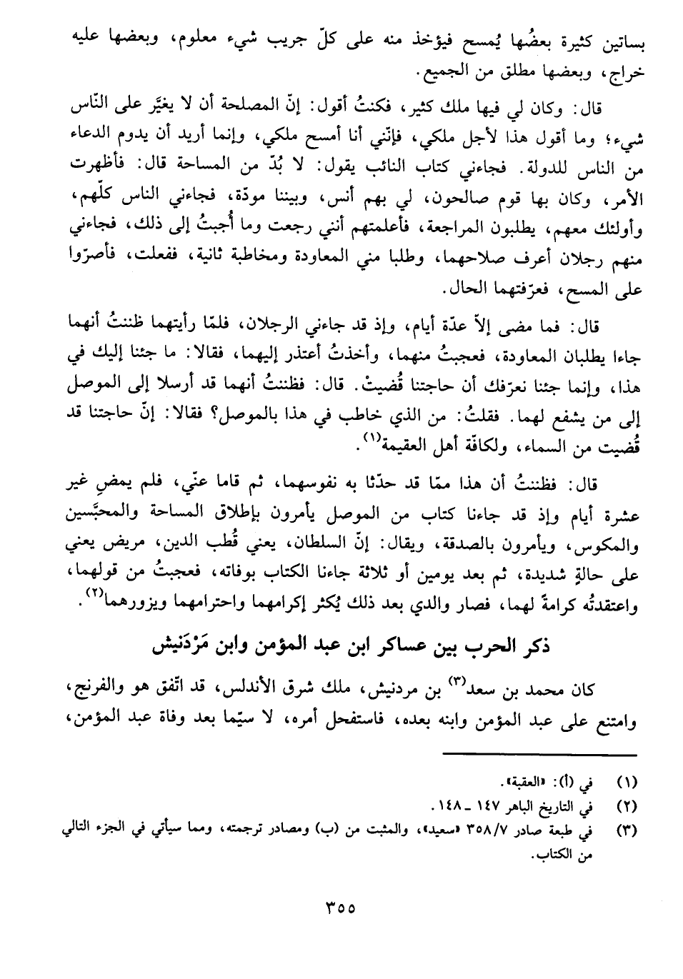 قَالَ: وَكَانَ لِي فِيهَا مِلْكٌ كَثِيرٌ، فَكُنْتُ أَقُولُ: إِنَّ الْمَصْلَحَةَ أَنْ لَا يُغَيَّرَ عَلَى النَّاسِ شَيْءٌ، وَمَا أَقُولُ هَذَا لِأَجْلِ مِلْكِي، فَإِنَّنِي أَنَا أَمْسَحُ مِلْكِي، وَإِنَّمَا أُرِيدُ أَنْ يَدُومَ الدُّعَاءُ مِنَ النَّاسِ لِلدَّوْلَةِ، فَجَاءَنِي كِتَابُ النَّائِبِ يَقُولُ: لَا بُدَّ مِنَ الْمِسَاحَةِ، قَالَ: فَأَظْهَرْتُ الْأَمْرَ، وَكَانَ بِهَا قَوْمٌ صَالِحُونَ، لِي بِهِمْ أُنْسٌ، وَبَيْنَنَا مَوَدَّةٌ، فَجَاءَنِي النَّاسُ كُلُّهُمْ، وَأُولَئِكَ مَعَهُمْ، يَطْلُبُونَ الْمُرَاجَعَةَ، فَأَعْلَمْتُهُمْ أَنَّنِي رَجَعْتُ وَمَا أُجِبْتُ إِلَى ذَلِكَ، فَجَاءَنِي مِنْهُمْ رَجُلَانِ أَعْرِفُ صَلَاحَهُمَا، وَطَلَبَا مِنِّي الْمُعَاوَدَةَ وَمُخَاطَبَةً ثَانِيَةً، فَفَعَلْتُ، فَأَصَرُّوا عَلَى الْمَسْحِ، فَعَرَّفْتُهُمَا الْحَالَ.