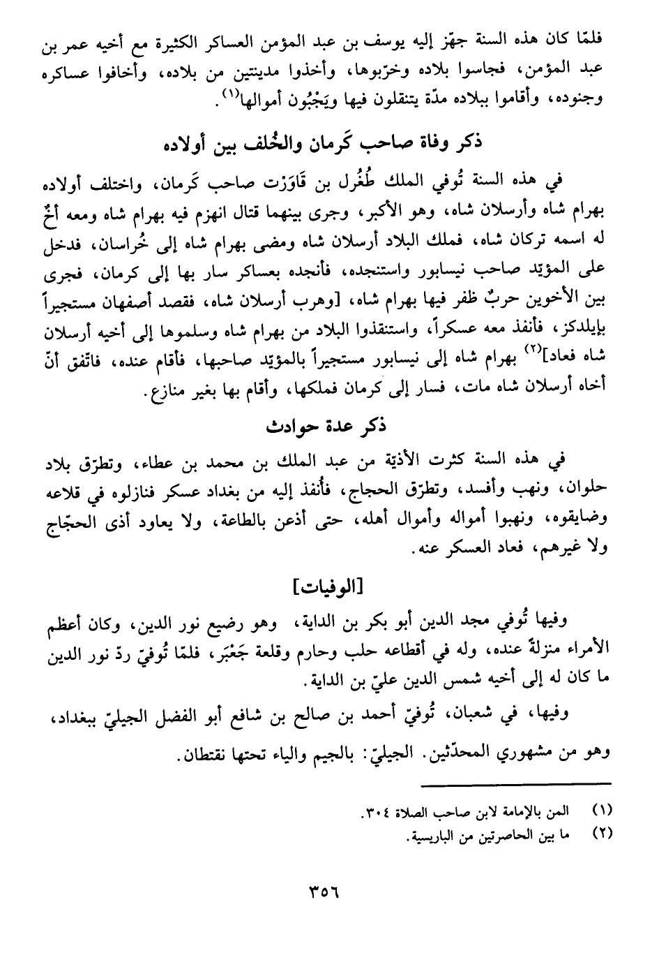 فِي هَذِهِ السَّنَةِ تُوُفِّيَ الْمَلِكُ طُغْرُلُ بْنُ قَاوَرْتَ صَاحِبُ كَرْمَانَ، وَاخْتَلَفَ أَوْلَادُهُ بَهْرَام شَاهْ وَأَرْسِلَان شَاهْ، وَهُوَ الْأَكْبَرُ، وَجَرَى بَيْنَهُمَا قِتَالٌ انْهَزَمَ فِيهِ بَهْرَام شَاهْ وَمَعَهُ أَخٌ لَهُ اسْمُهُ تُرْكَان شَاهْ، فَمَلَكَ الْبِلَادَ أَرْسِلَان شَاهْ، وَمَضَى بَهْرَام شَاهْ إِلَى خُرَاسَانَ، فَدَخَلَ عَلَى الْمُؤَيَّدِ صَاحِبِ نَيْسَابُورَ وَاسْتَنْجَدَهُ، فَأَنْجَدَهُ بِعَسَاكِرَ سَارَ بِهَا إِلَى كَرْمَانَ، فَجَرَى بَيْنَ الْأَخَوَيْنِ حَرْبٌ ظَفِرَ فِيهَا بَهْرَام شَاهْ، [وَهَرَبَ أَرْسِلَان شَاهْ، فَقَصَدَ أَصْفَهَانَ مُسْتَجِيرًا بِإِيلْدِكْزَ، فَأَنْفَذَ مَعَهُ عَسْكَرًا، وَاسْتَنْقَذُوا الْبِلَادَ مِنْ بَهْرَام شَاهْ وَسَلَّمُوهَا إِلَى أَخِيهِ أَرْسِلَان شَاهْ فَعَادَ] بَهْرَام شَاهْ إِلَى نَيْسَابُورَ مُسْتَجِيرًا بِالْمُؤَيَّدِ صَاحِبِهَا، فَأَقَامَ عِنْدَهُ، فَاتَّفَقَ أَنَّ أَخَاهُ أَرْسِلَان شَاهْ مَاتَ، فَسَارَ إِلَى كَرْمَانَ، فَمَلَكَهَا، وَأَقَامَ بِهَا بِغَيْرِ مُنَازِعٍ.