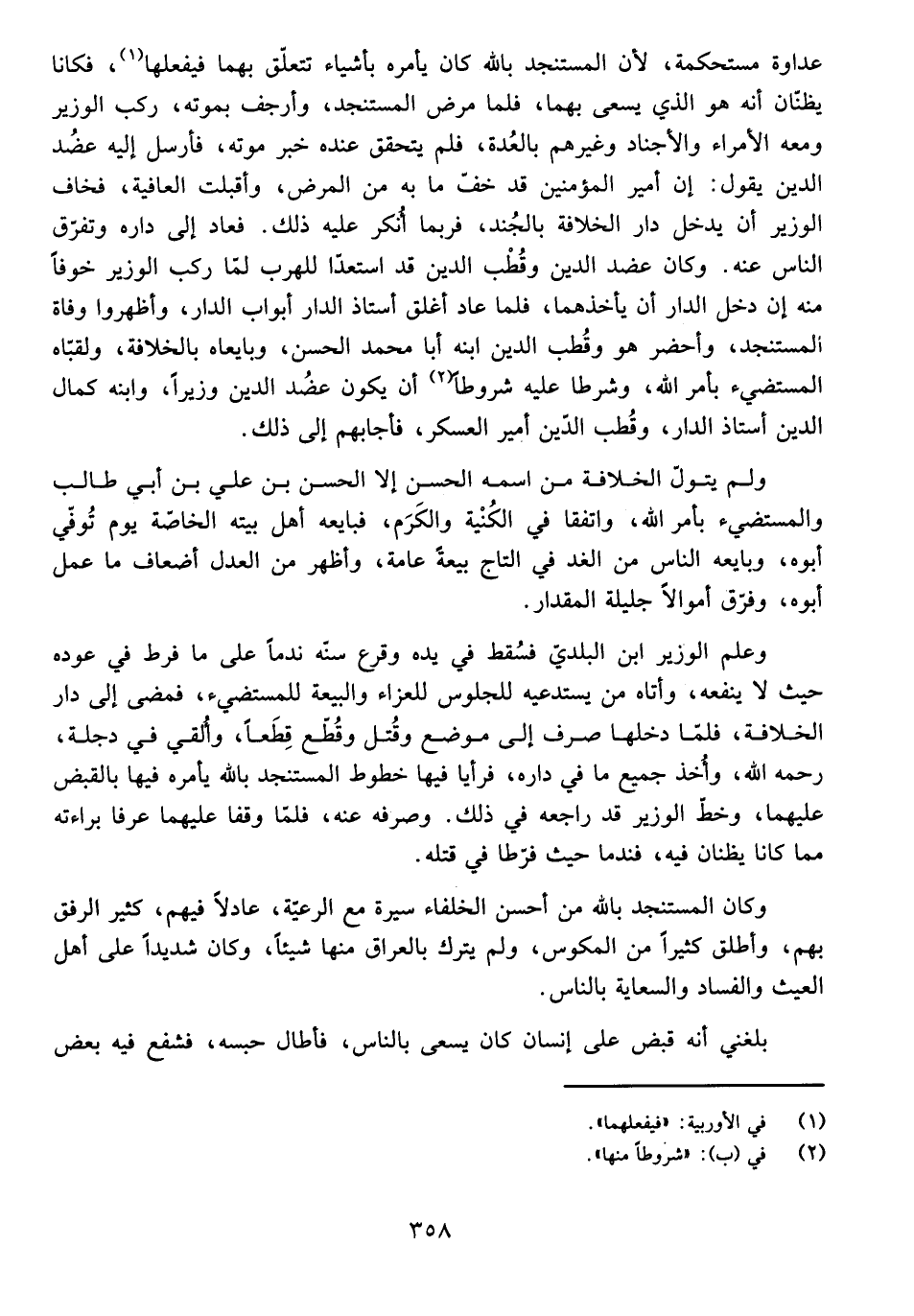 عَدَاوَةٌ مُسْتَحْكِمَةٌ، لِأَنَّ الْمُسْتَنْجِدَ بِاللَّهِ كَانَ يَأْمُرُهُ بِأَشْيَاءَ تَتَعَلَّقُ بِهِمَا فَيَفْعَلُهَا، فَكَانَا يَظُنَّانِ أَنَّهُ هُوَ الَّذِي يَسْعَى بِهِمَا، فَلَمَّا مَرِضَ الْمُسْتَنْجِدُ وَأُرْجِفَ بِمَوْتِهِ، رَكِبَ الْوَزِيرُ وَمَعَهُ الْأُمَرَاءُ وَالْأَجْنَادُ وَغَيْرُهُمْ بِالْعُدَّةِ، فَلَمْ يَتَحَقَّقْ عِنْدَهُ خَبَرُ مَوْتِهِ، فَأَرْسَلَ إِلَيْهِ عَضُدُ الدِّينِ يَقُولُ: إِنْ أَمِيرَ الْمُؤْمِنِينَ قَدْ خَفَّ مَا بِهِ مِنَ الْمَرَضِ، وَأَقْبَلَتِ الْعَافِيَةُ، فَخَافَ الْوَزِيرُ أَنْ يَدْخُلَ دَارَ الْخِلَافَةِ بِالْجُنْدِ، فَرُبَّمَا أَنْكَرَ عَلَيْهِ ذَلِكَ، فَعَادَ إِلَى دَارِهِ، وَتَفَرَّقَ النَّاسُ عَنْهُ، وَكَانَ عَضُدُ الدِّينِ وَقُطْبُ الدِّينِ قَدِ اسْتَعَدَّا لِلْهَرَبِ لَمَّا رَكِبَ الْوَزِيرُ خَوْفًا مِنْهُ إِنْ دَخَلَ الدَّارَ أَنْ يَأْخُذَهُمَا، فَلَمَّا عَادَ أَغْلَقَ أُسْتَاذُ الدَّارِ أَبْوَابَ الدَّارِ، وَأَظْهَرُوا وَفَاةَ الْمُسْتَنْجِدِ، وَأَحْضَرَ هُوَ وَقُطْبُ الدِّينِ ابْنَهُ أَبَا مُحَمَّدٍ الْحَسَنَ، وَبَايَعَاهُ بِالْخِلَافَةِ، وَلَقَّبَاهُ الْمُسْتَضِيءَ بِأَمْرِ اللَّهِ، وَشَرَطَ عَلَيْهِ شُرُوطًا أَنْ يَكُونَ عَضُدُ الدِّينِ وَزِيرًا، وَابْنُهُ كَمَالُ الدِّينِ أُسْتَاذَ الدَّارِ، وَقُطْبُ الدِّينِ أَمِيرَ الْعَسْكَرِ، فَأَجَابَهُمْ إِلَى ذَلِكَ.